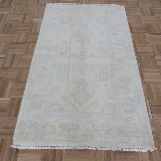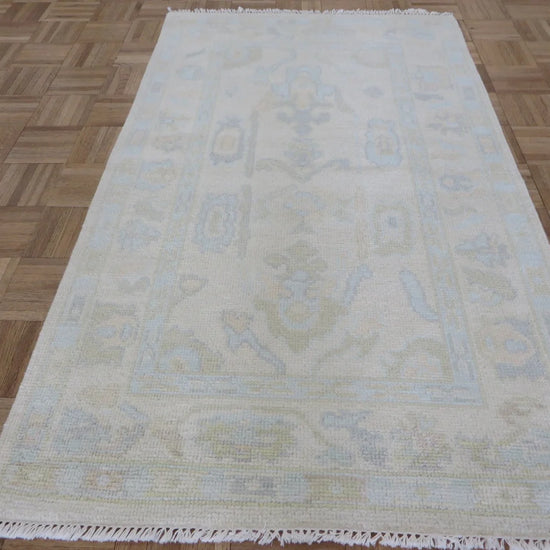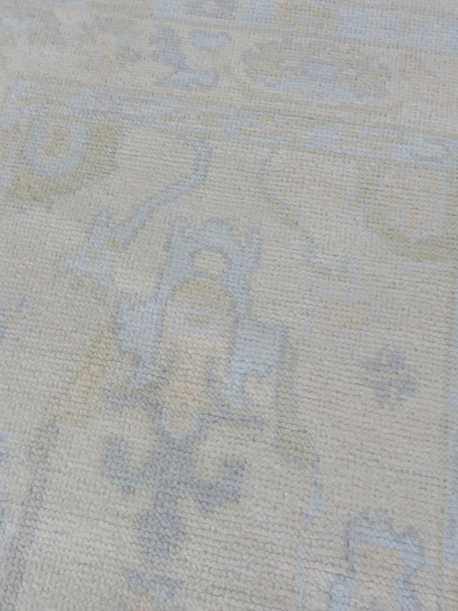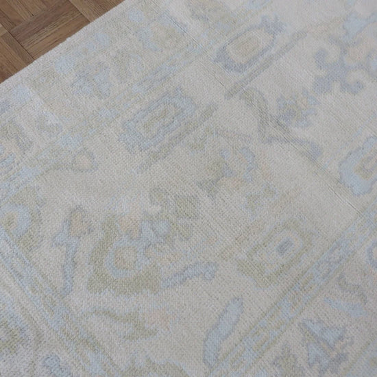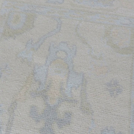 This modern, newly produced hand-knotted Oushak is expertly crafted in India using the Persian knot and composed of 100% hand-spun wool, naturally dyed with vegetable dyes. For custom sizing inquiries, please contact us directly.