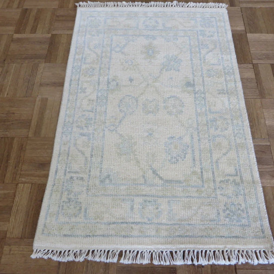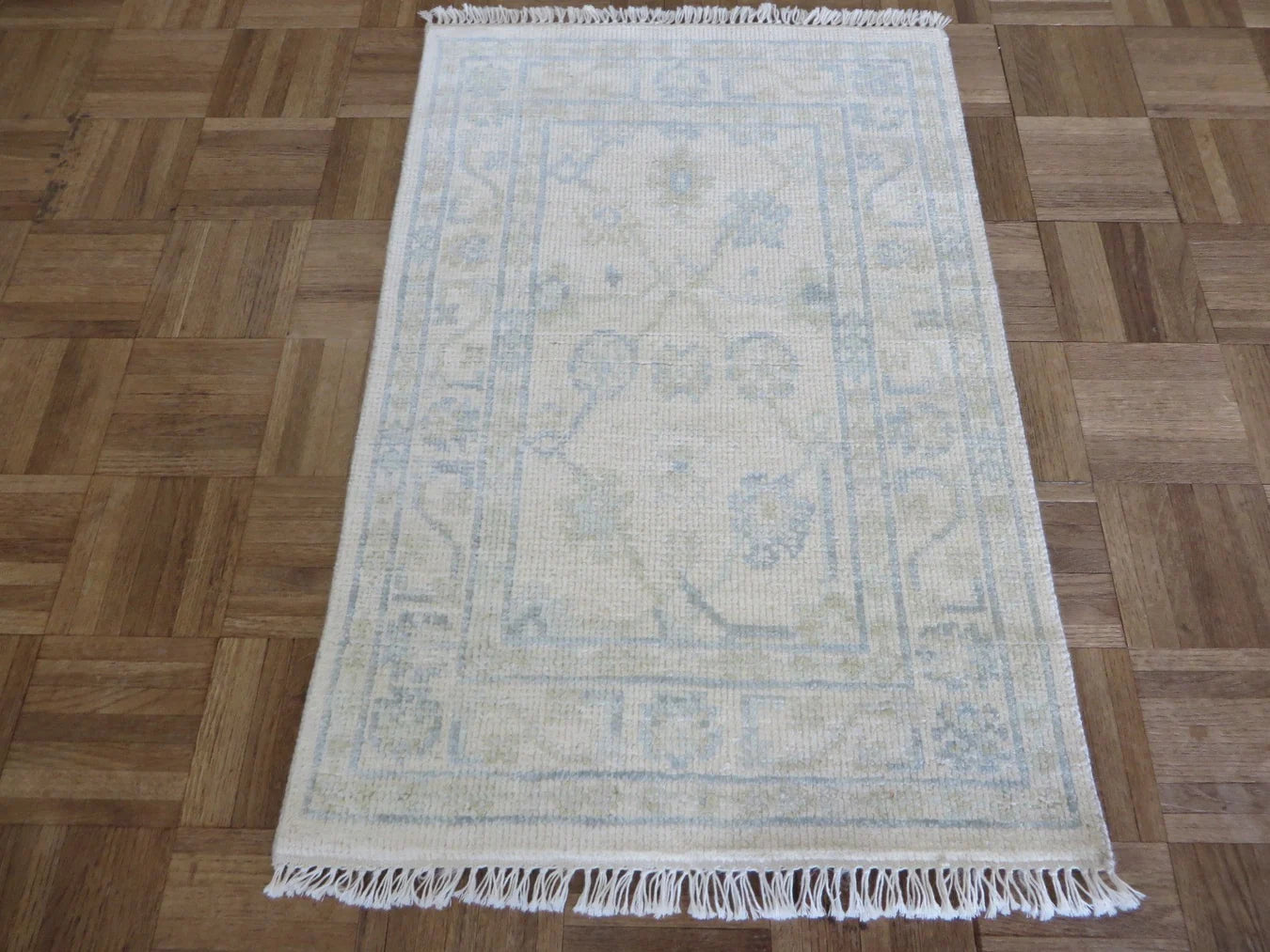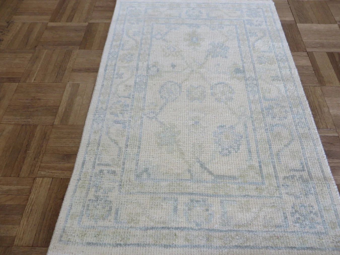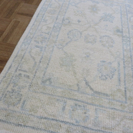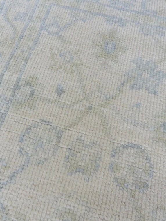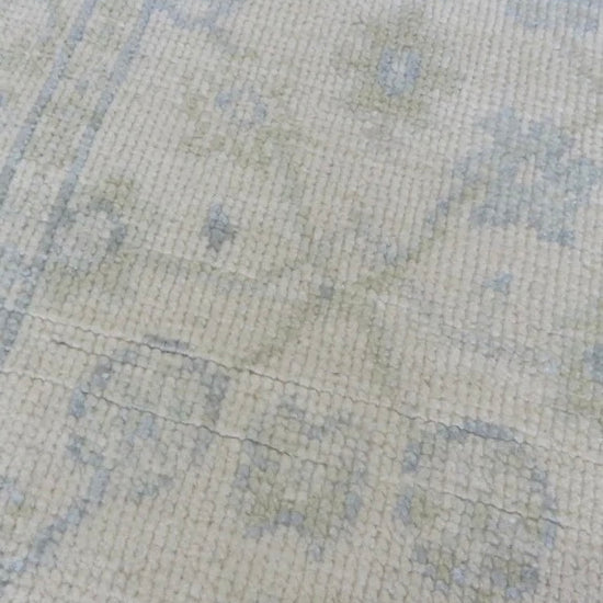 This modern, newly produced hand-knotted Oushak is expertly crafted in India using the Persian knot and composed of 100% hand-spun wool, naturally dyed with vegetable dyes. For custom sizing inquiries, please contact us directly.