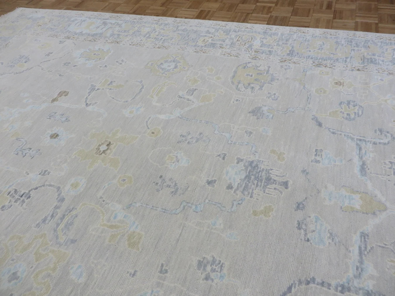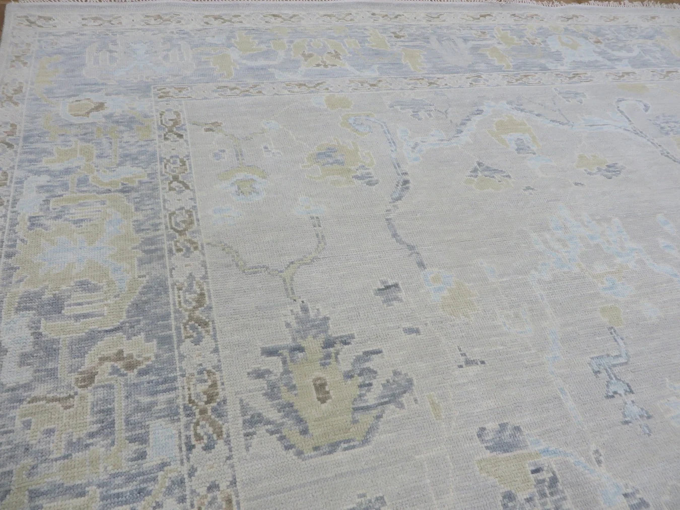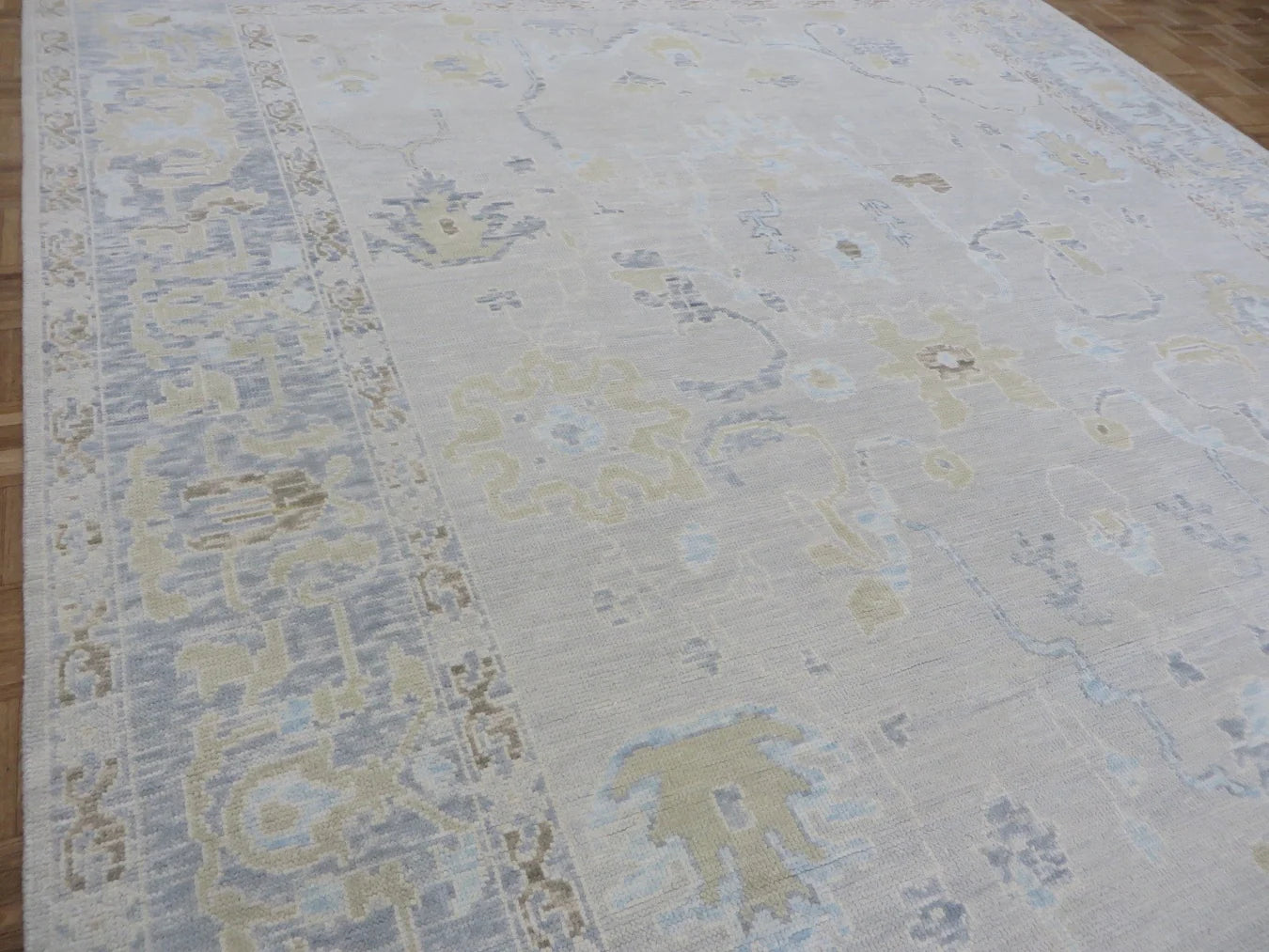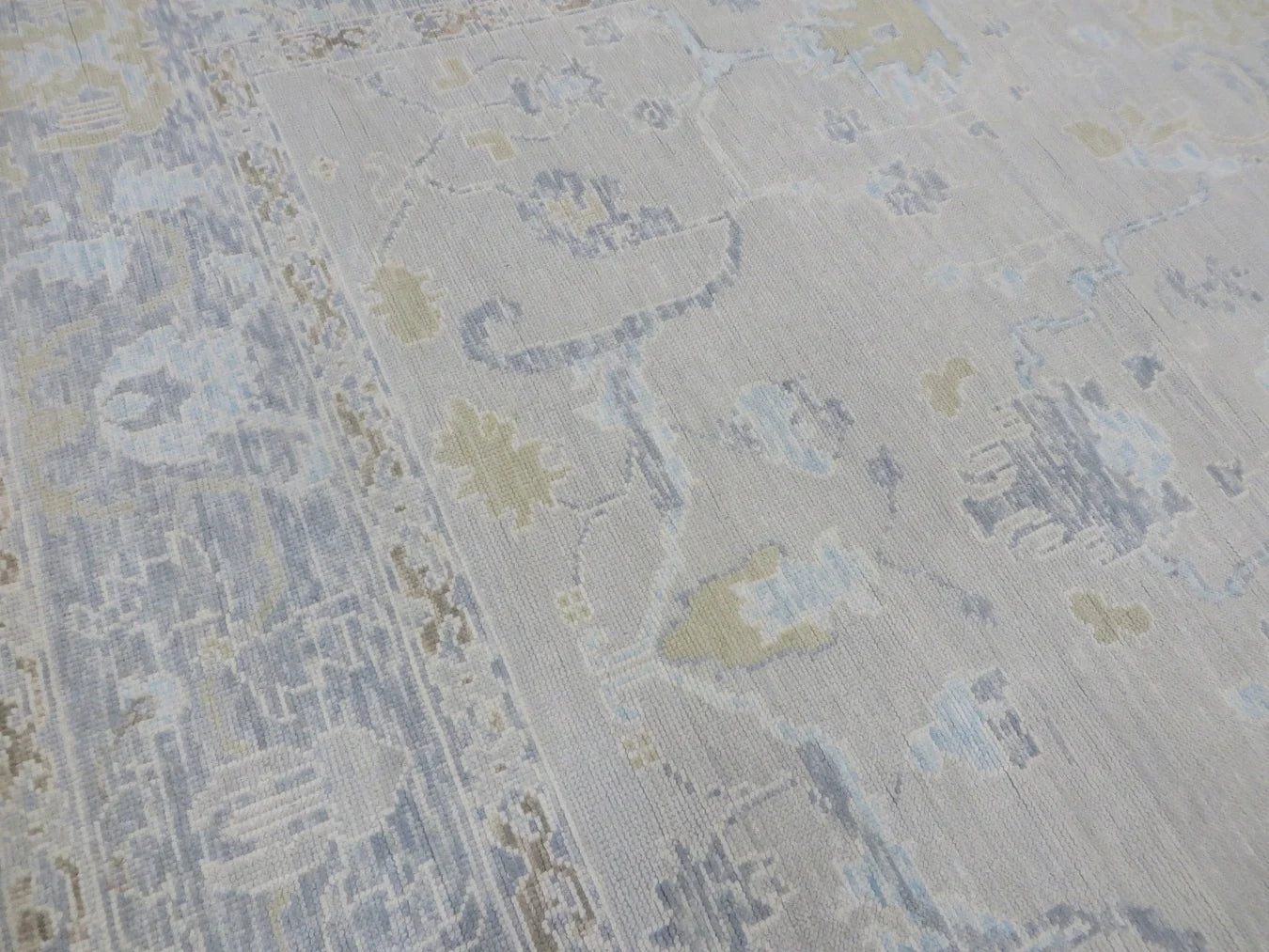 This modern, newly produced hand-knotted Oushak is expertly crafted in India using the Persian knot and composed of 100% hand-spun wool, naturally dyed with vegetable dyes. For custom sizing inquiries, please contact us directly.