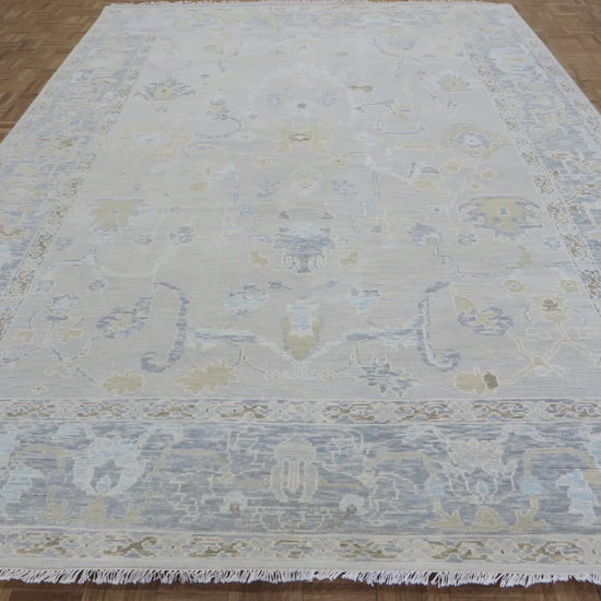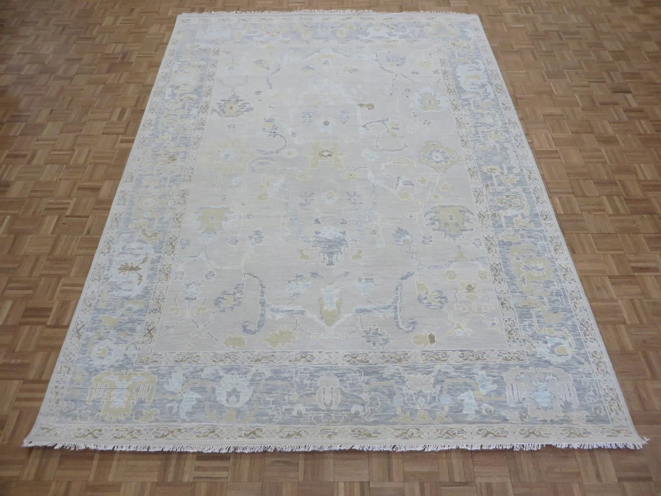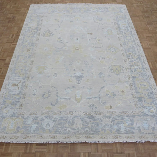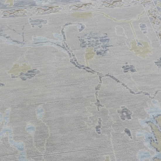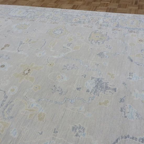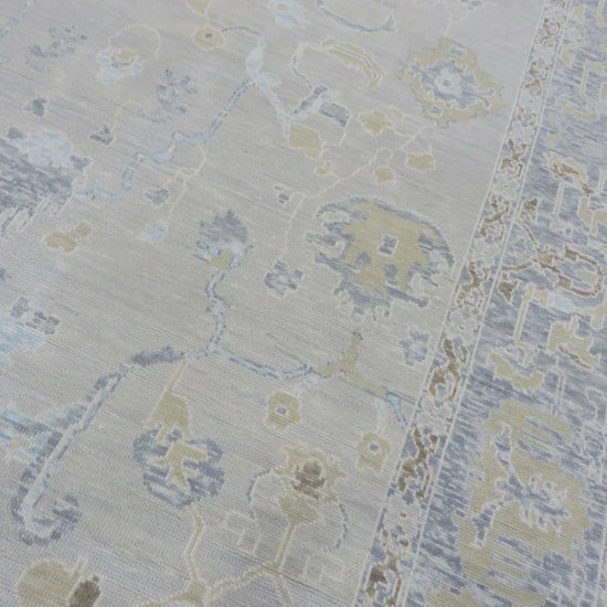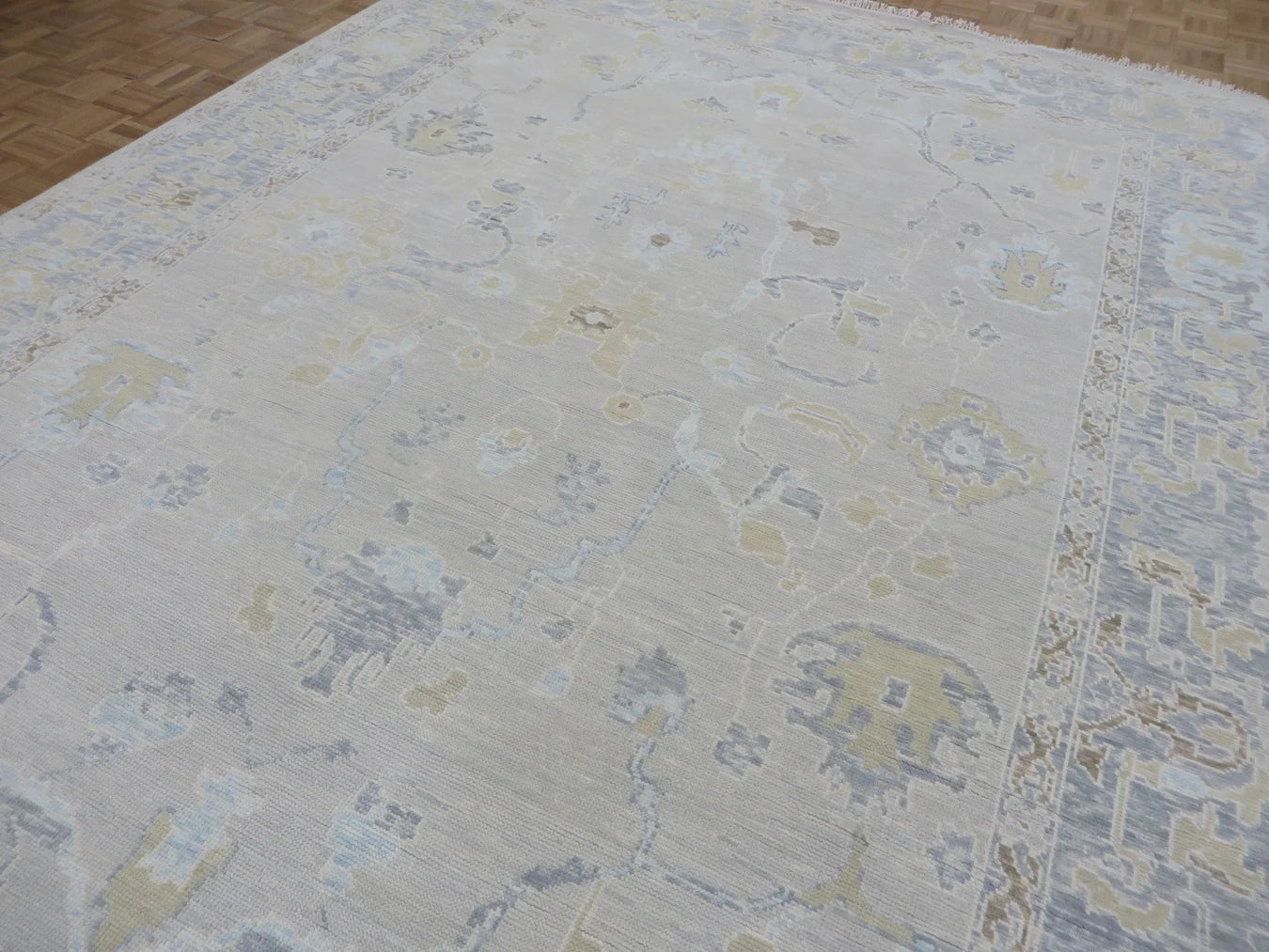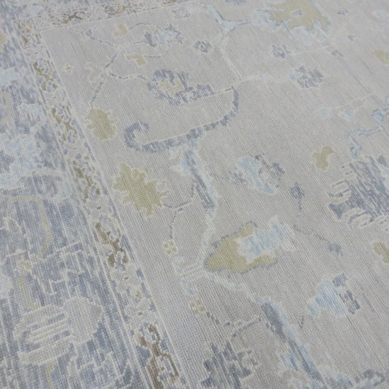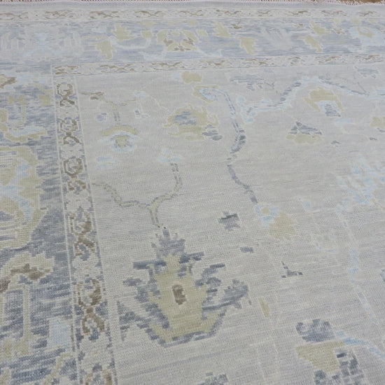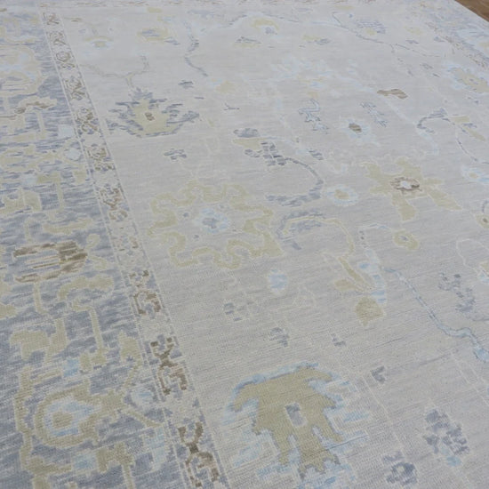 This modern, newly produced hand-knotted Oushak is expertly crafted in India using the Persian knot and composed of 100% hand-spun wool, naturally dyed with vegetable dyes. For custom sizing inquiries, please contact us directly.