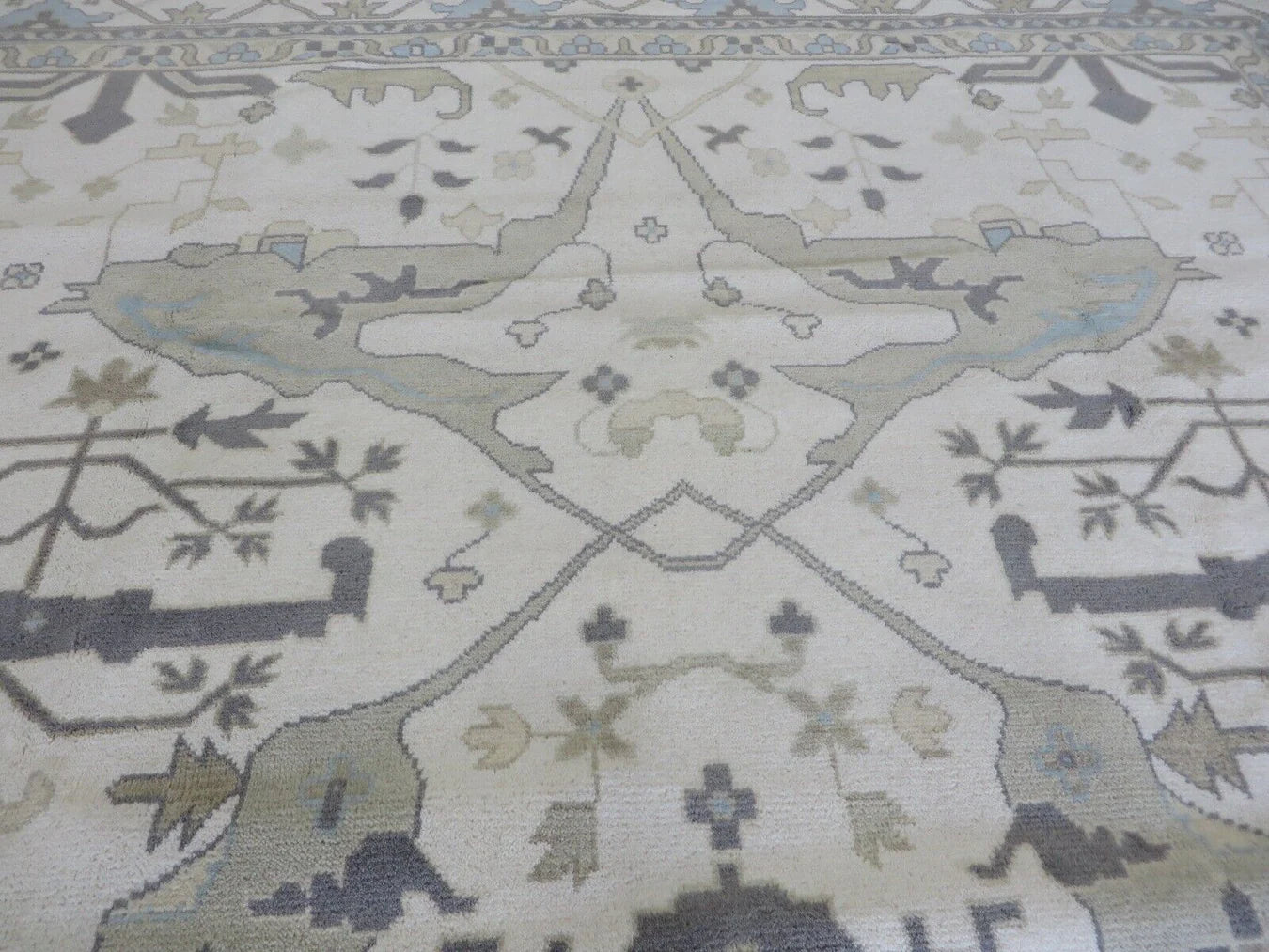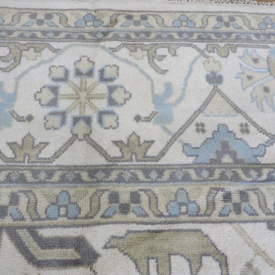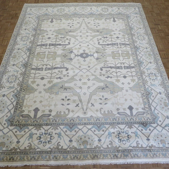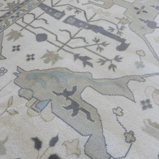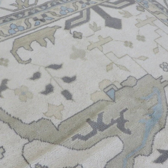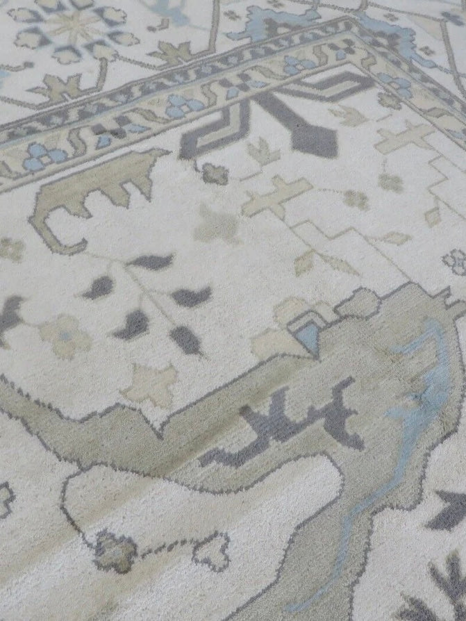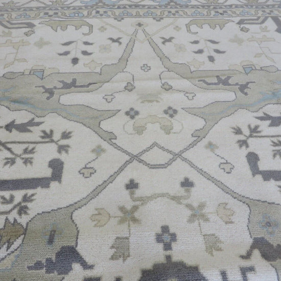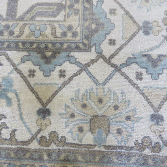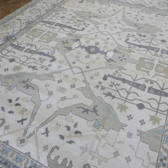 This modern, newly produced hand-knotted Oushak is expertly crafted in India using the Persian knot and composed of 100% hand-spun wool, naturally dyed with vegetable dyes. For custom sizing inquiries, please contact us directly.