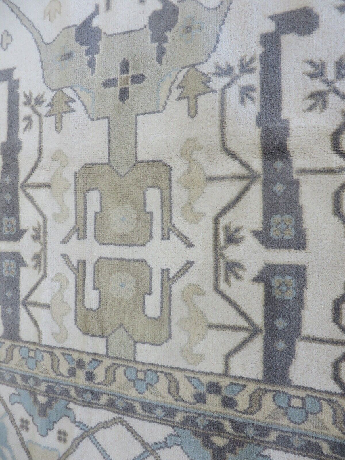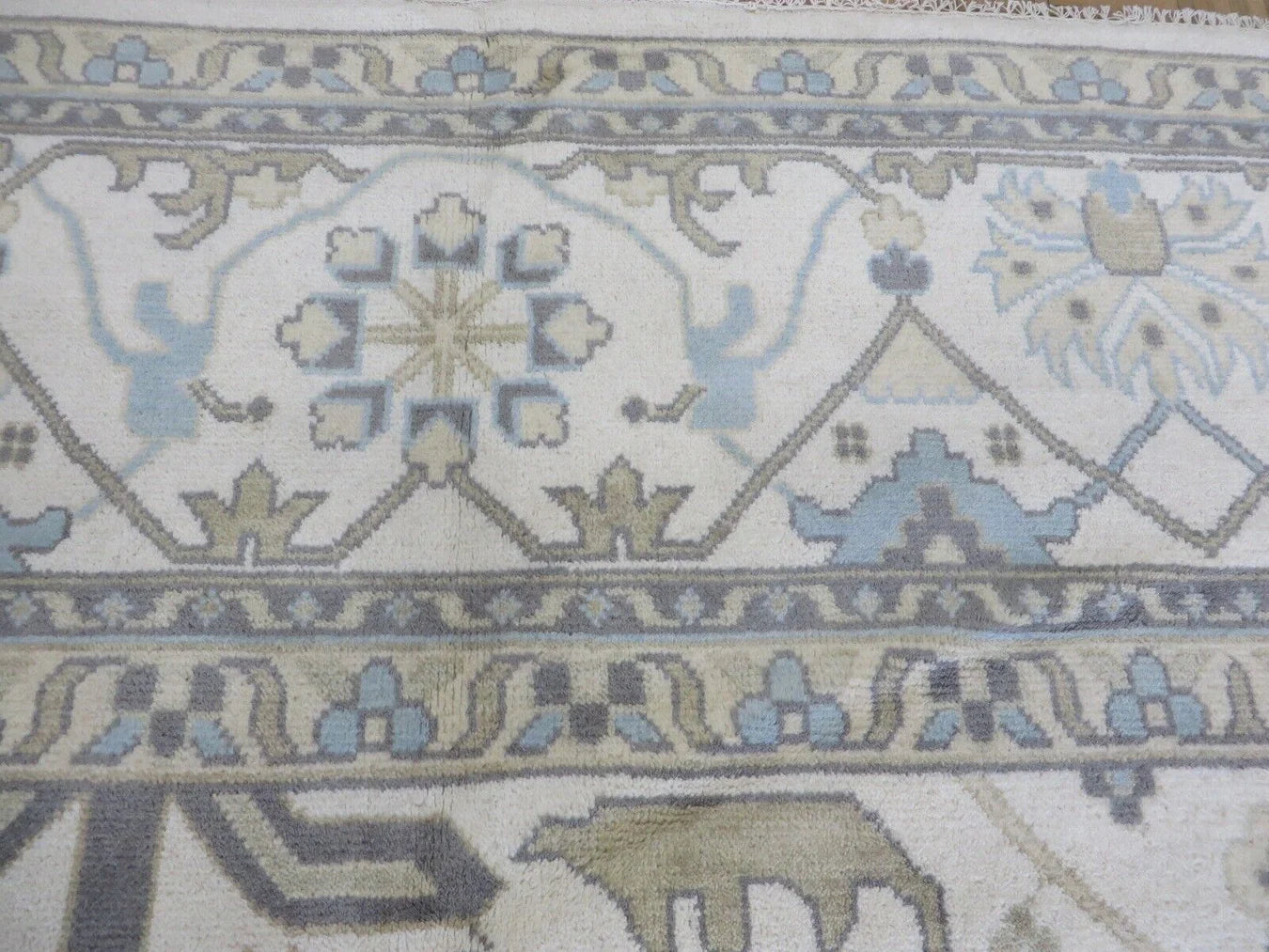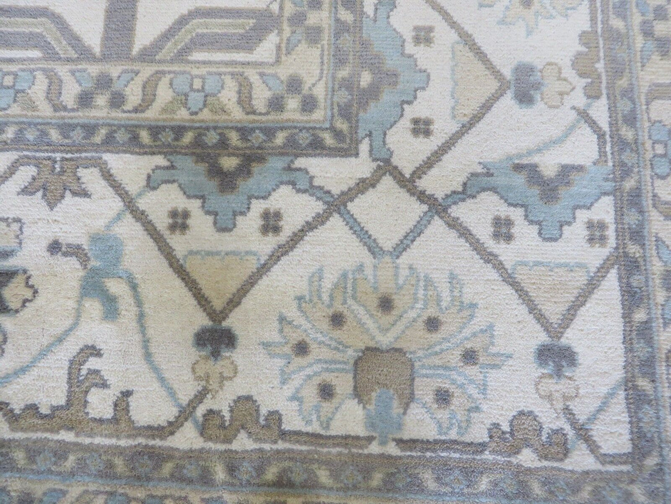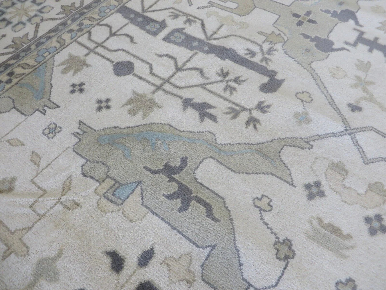This modern, newly produced hand-knotted Oushak is expertly crafted in India using the Persian knot and composed of 100% hand-spun wool, naturally dyed with vegetable dyes. For custom sizing inquiries, please contact us directly.