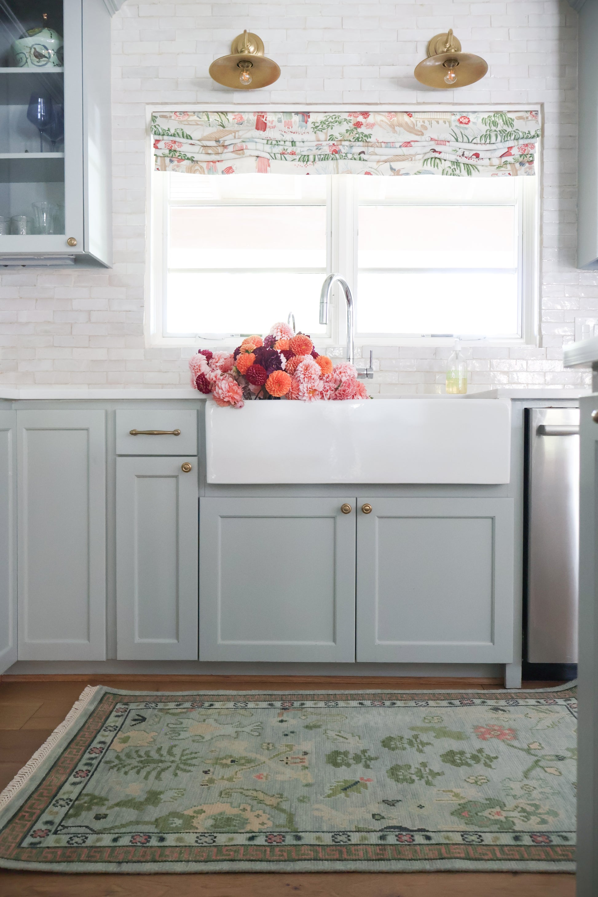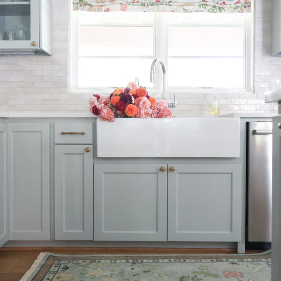This Modern Oushak rug is a new production piece, hand-knotted in India with 100% wool and dyed using natural, vegetable-based colors. The 5/5 Turkish knot construction gives it beautiful detail and lasting quality. This collaboration rug is final sale.