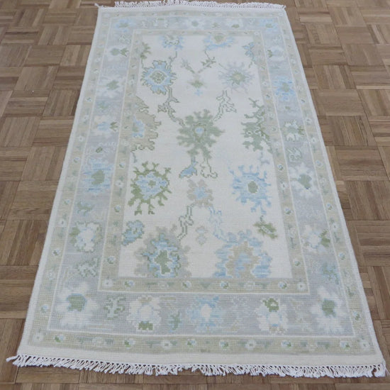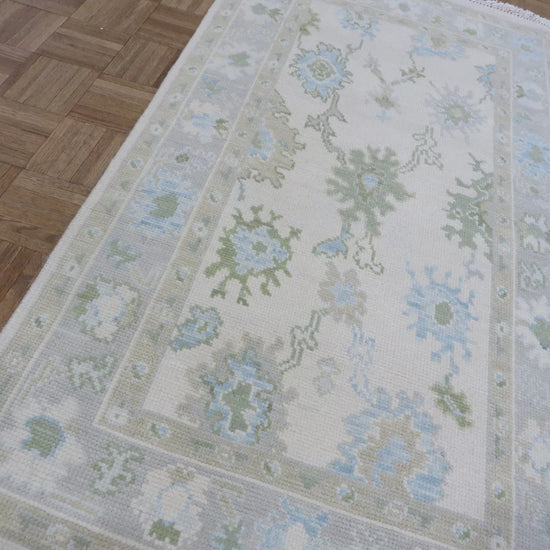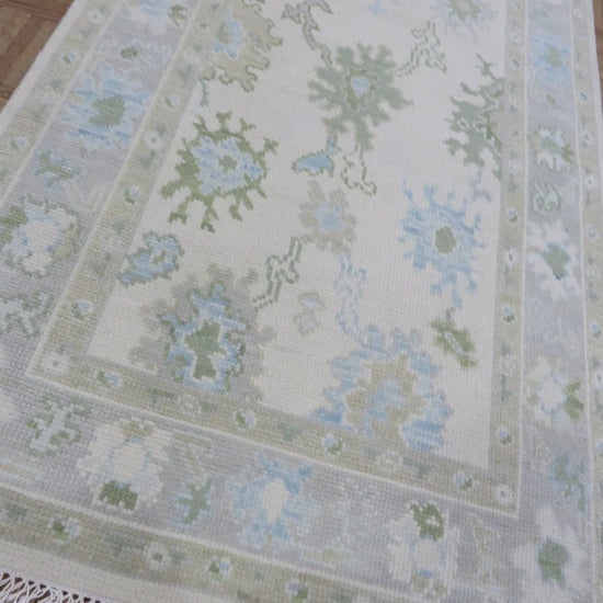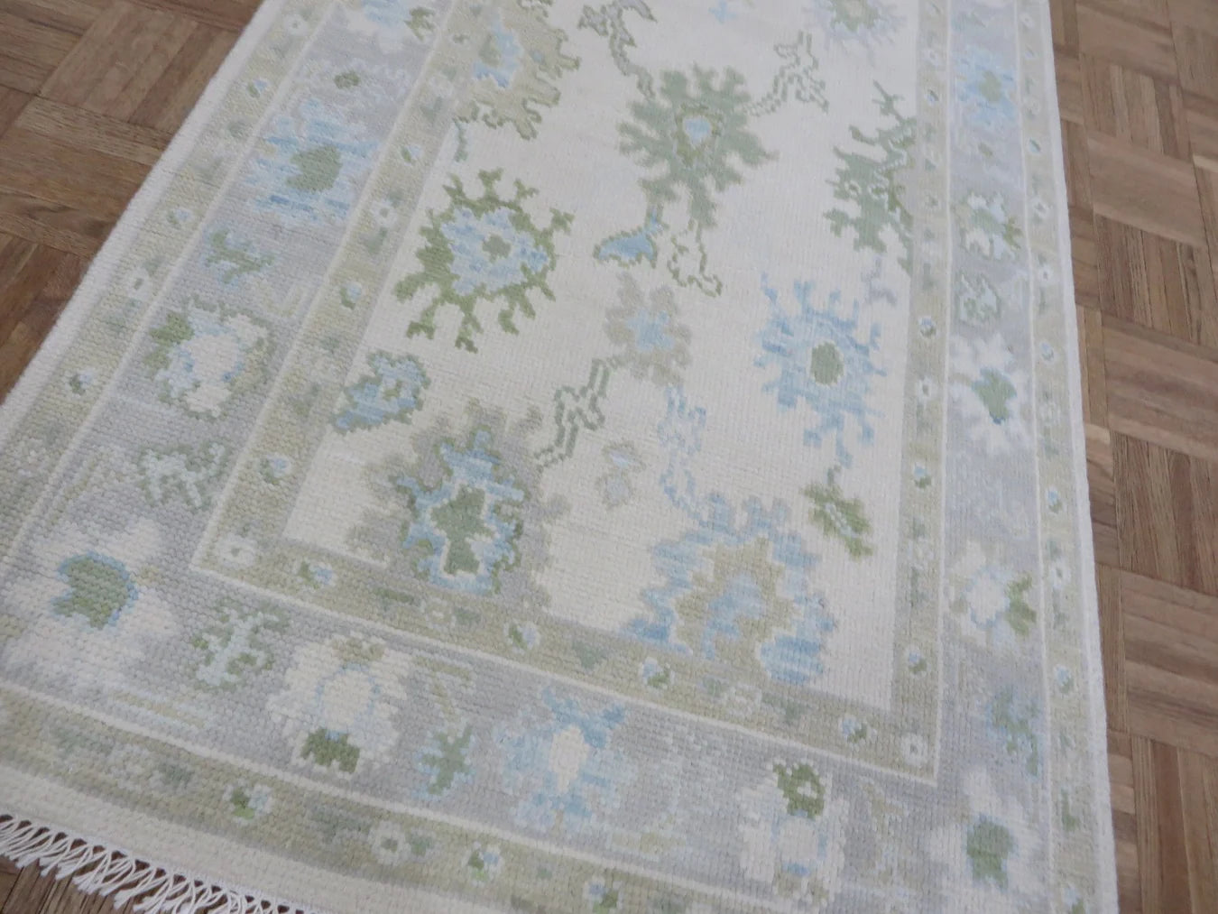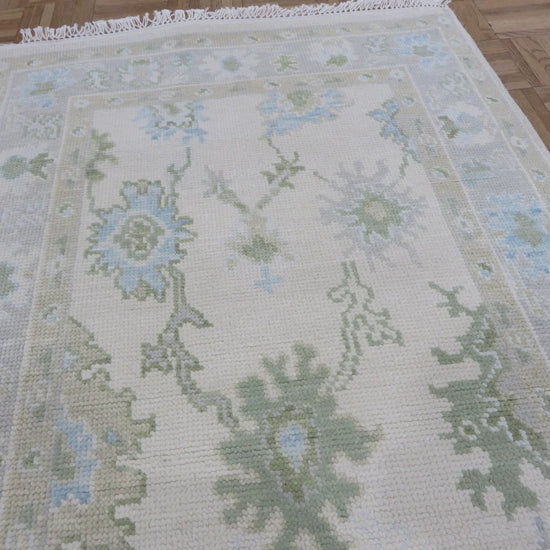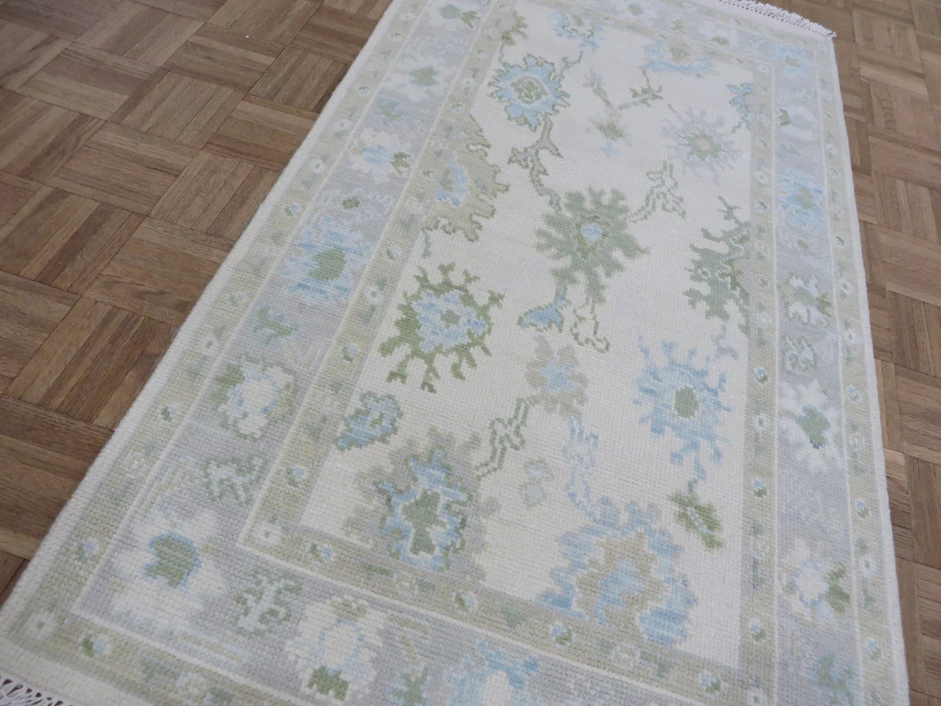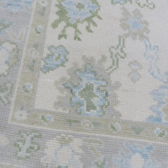 This modern, newly produced hand-knotted Oushak is expertly crafted in India using the Persian knot and composed of 100% hand-spun wool, naturally dyed with vegetable dyes. For custom sizing inquiries, please contact us directly.
