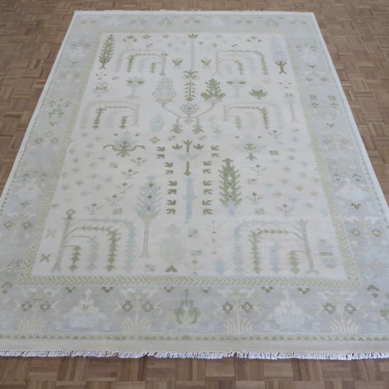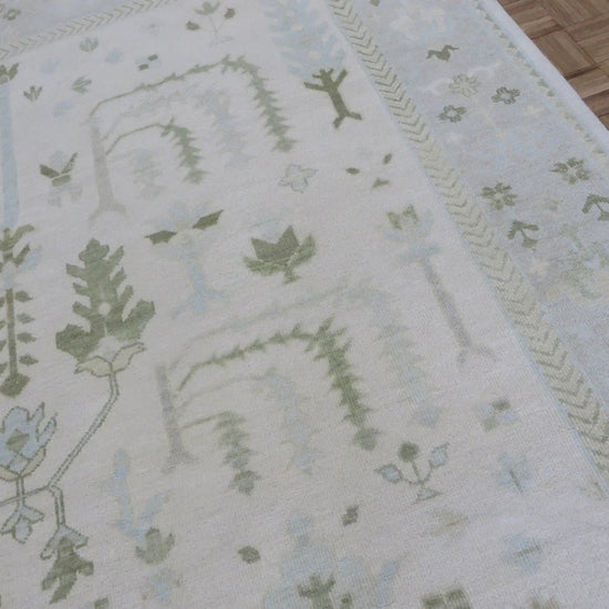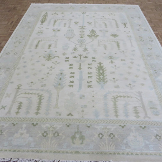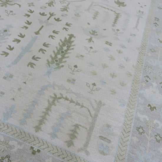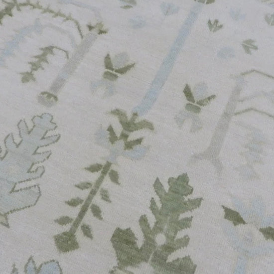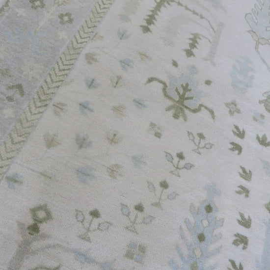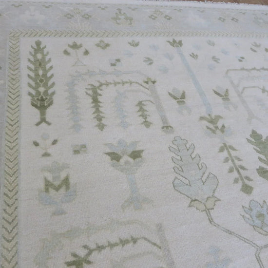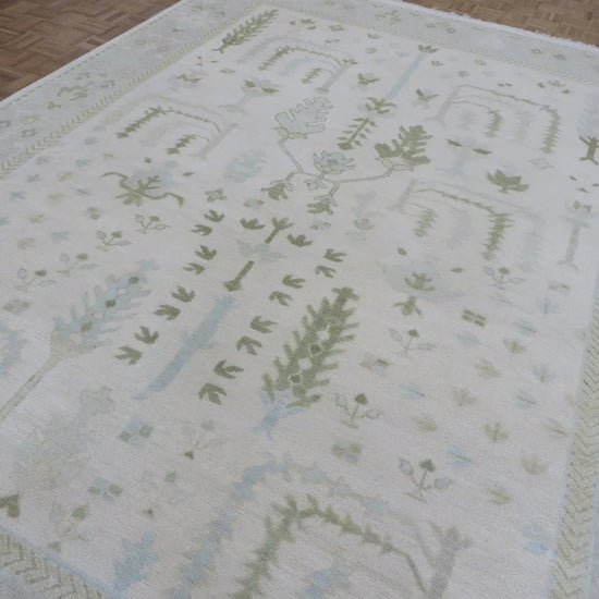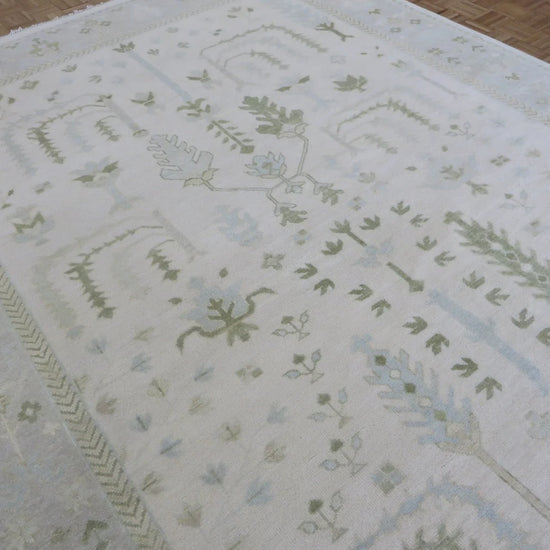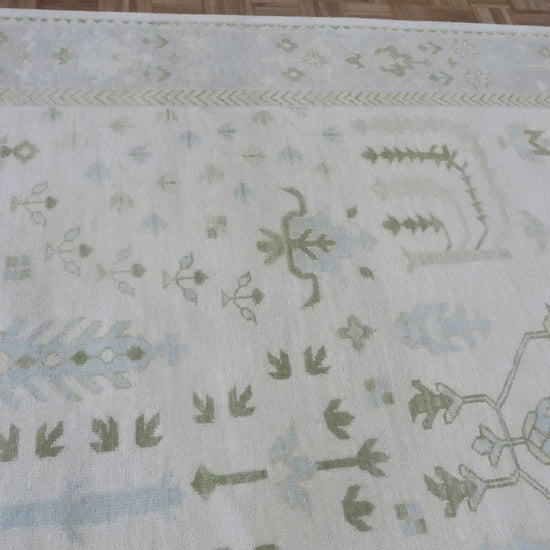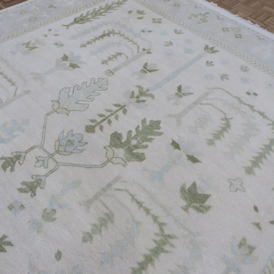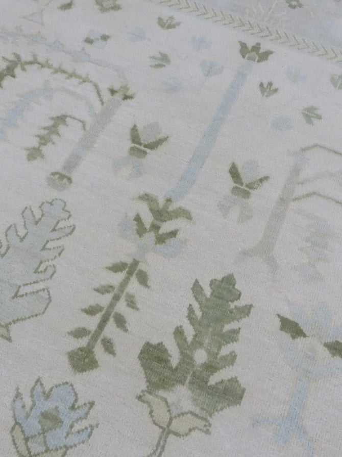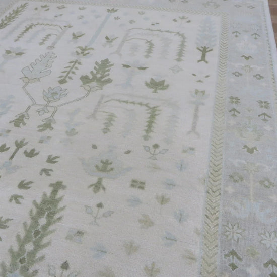 This modern, newly produced hand-knotted Oushak is expertly crafted in India using the Persian knot and composed of 100% hand-spun wool, naturally dyed with vegetable dyes. For custom sizing inquiries, please contact us directly.