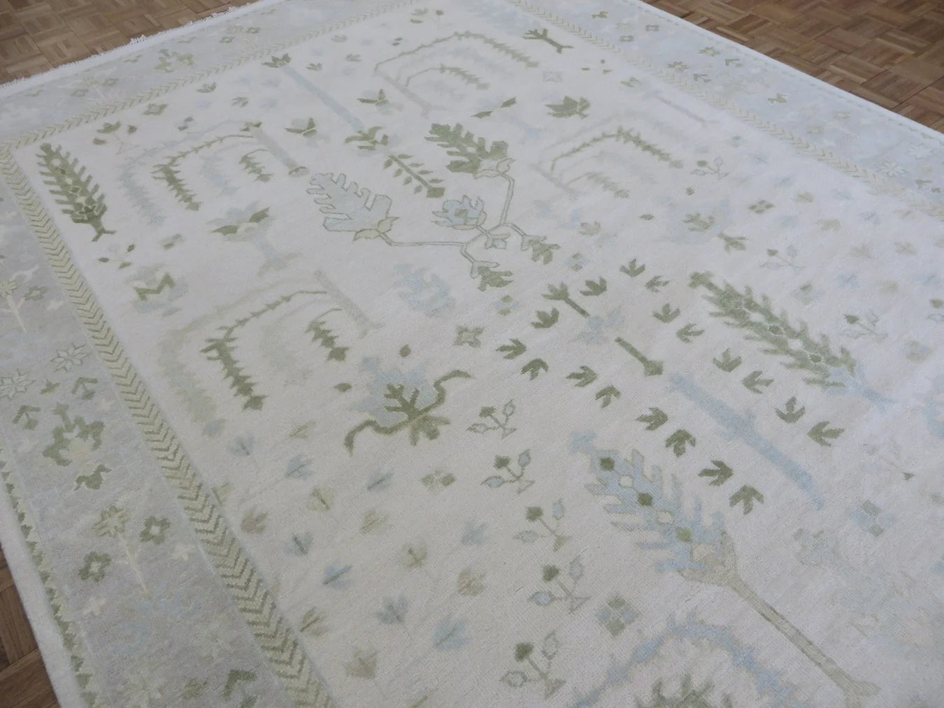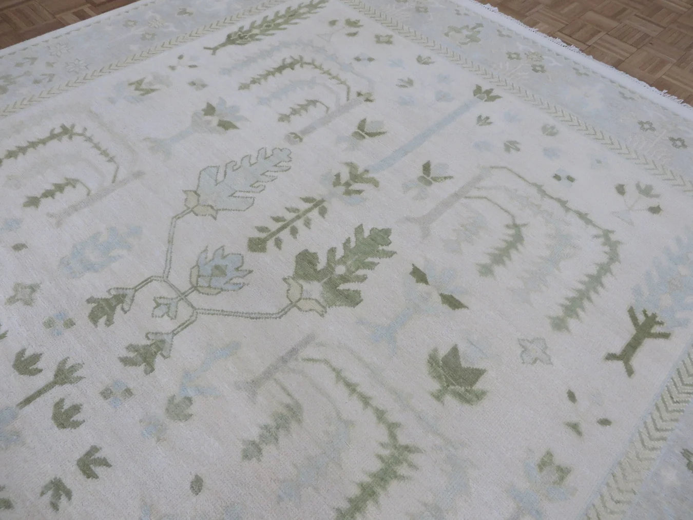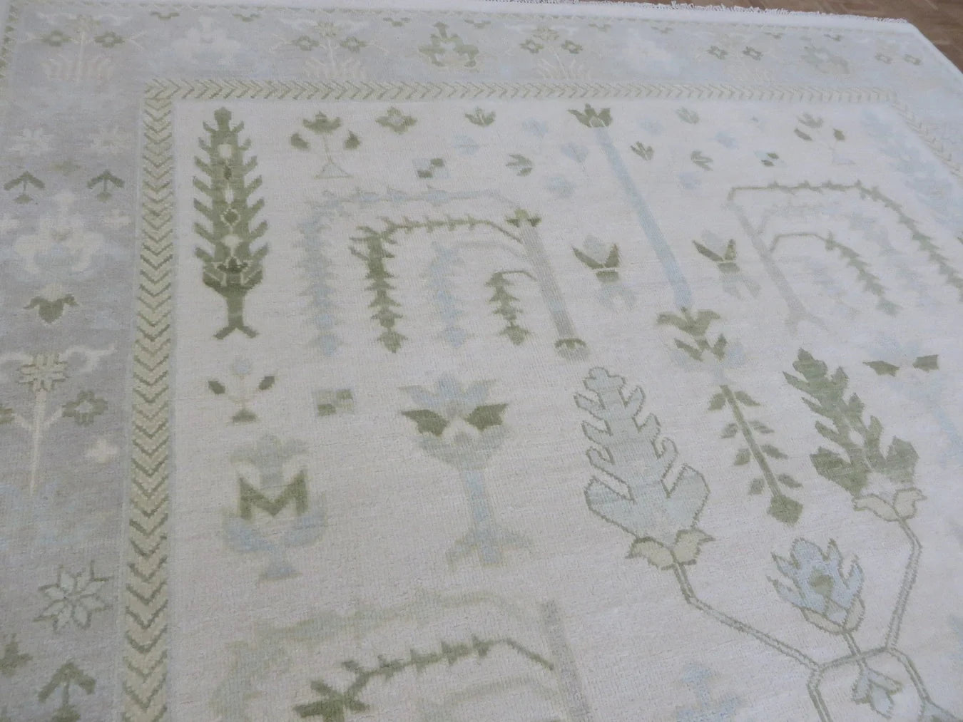 This modern, newly produced hand-knotted Oushak is expertly crafted in India using the Persian knot and composed of 100% hand-spun wool, naturally dyed with vegetable dyes. For custom sizing inquiries, please contact us directly.