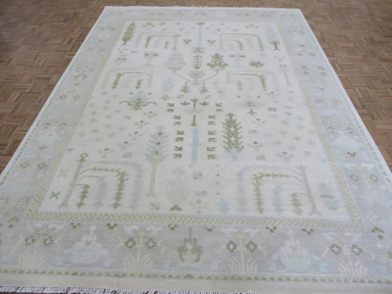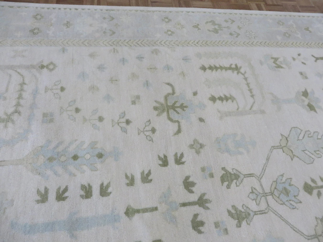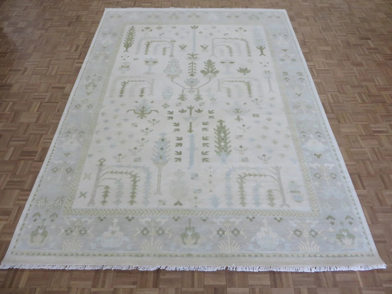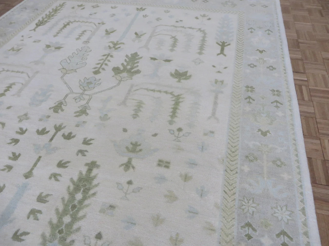 This modern, newly produced hand-knotted Oushak is expertly crafted in India using the Persian knot and composed of 100% hand-spun wool, naturally dyed with vegetable dyes. For custom sizing inquiries, please contact us directly.