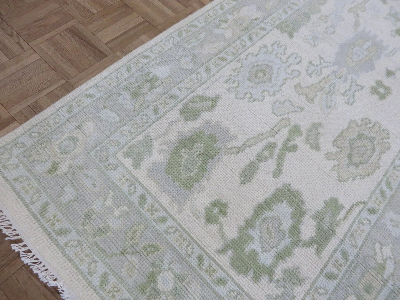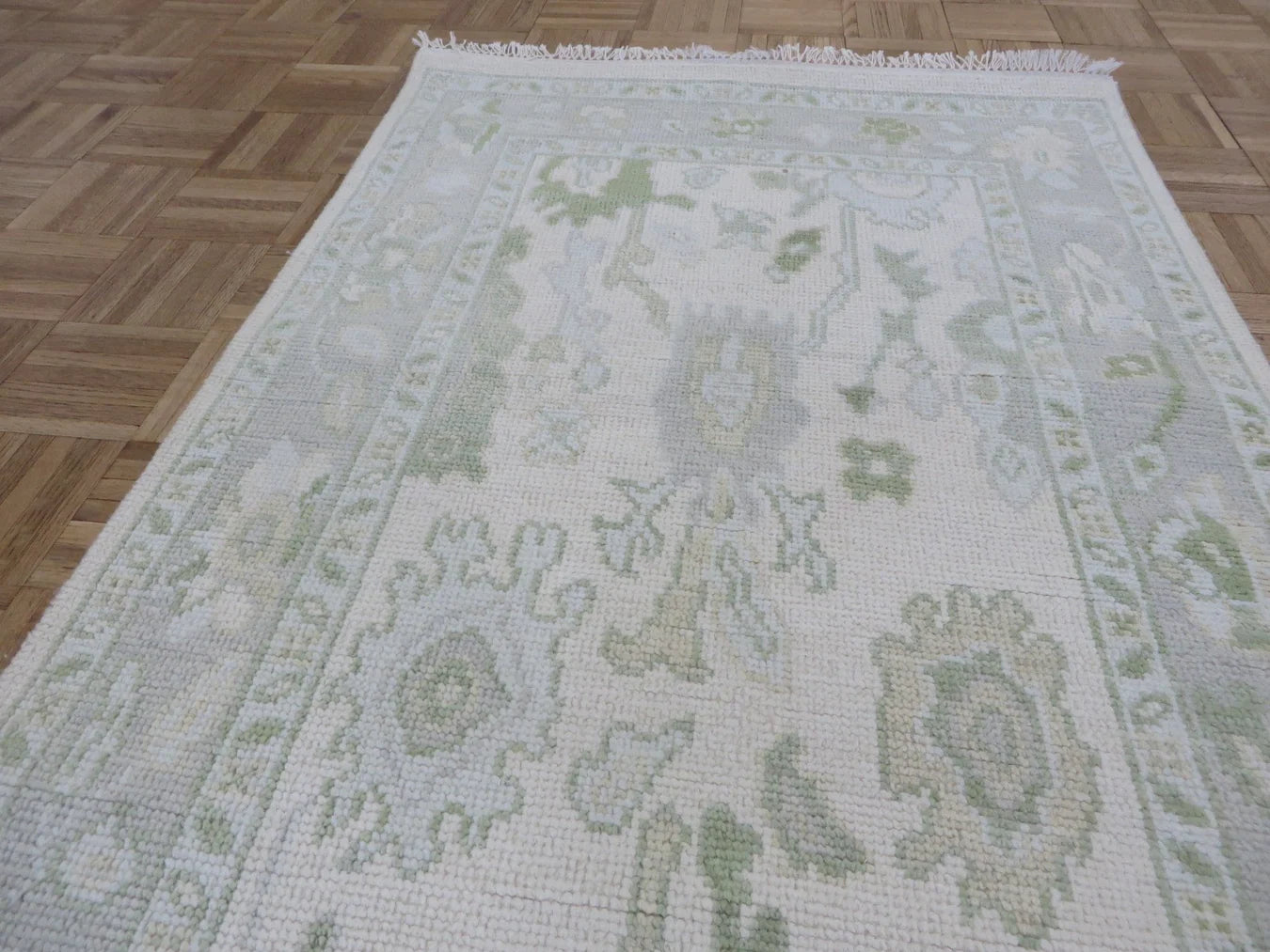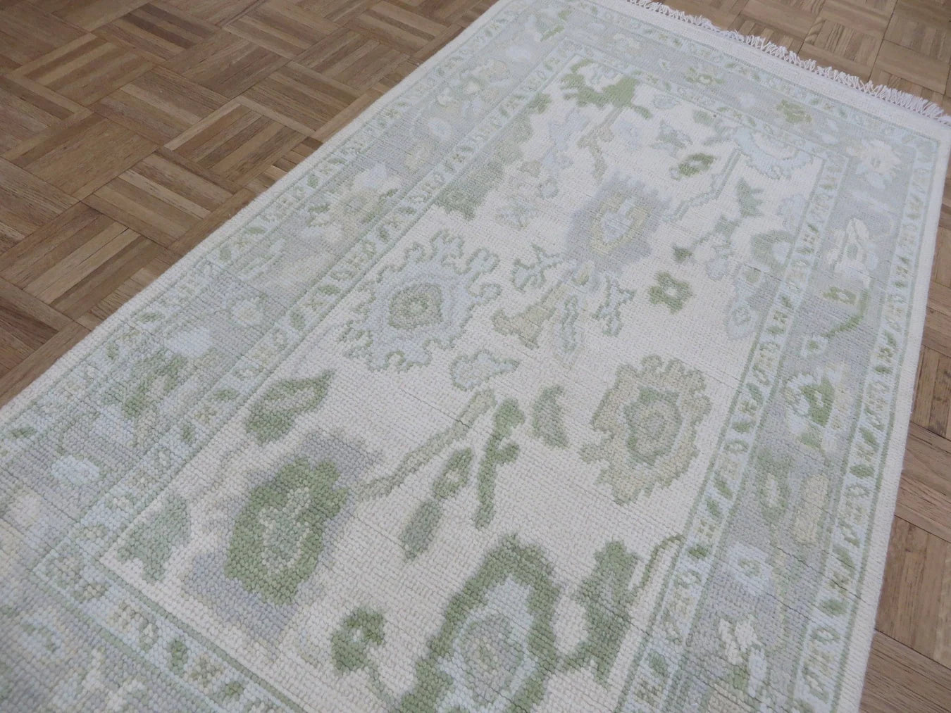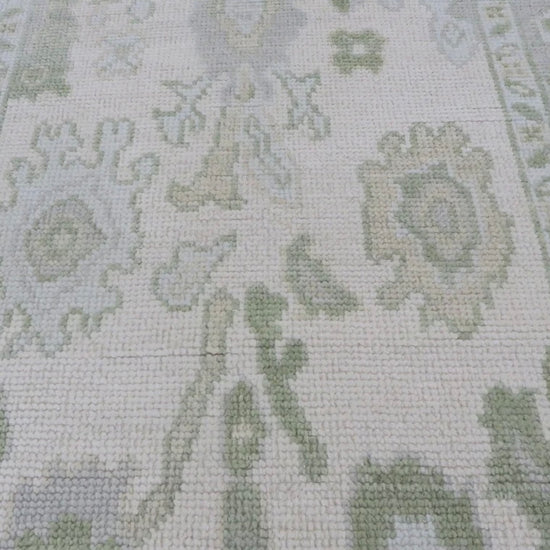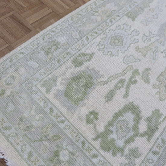 This modern, newly produced hand-knotted Oushak is expertly crafted in India using the Persian knot and composed of 100% hand-spun wool, naturally dyed with vegetable dyes. For custom sizing inquiries, please contact us directly.