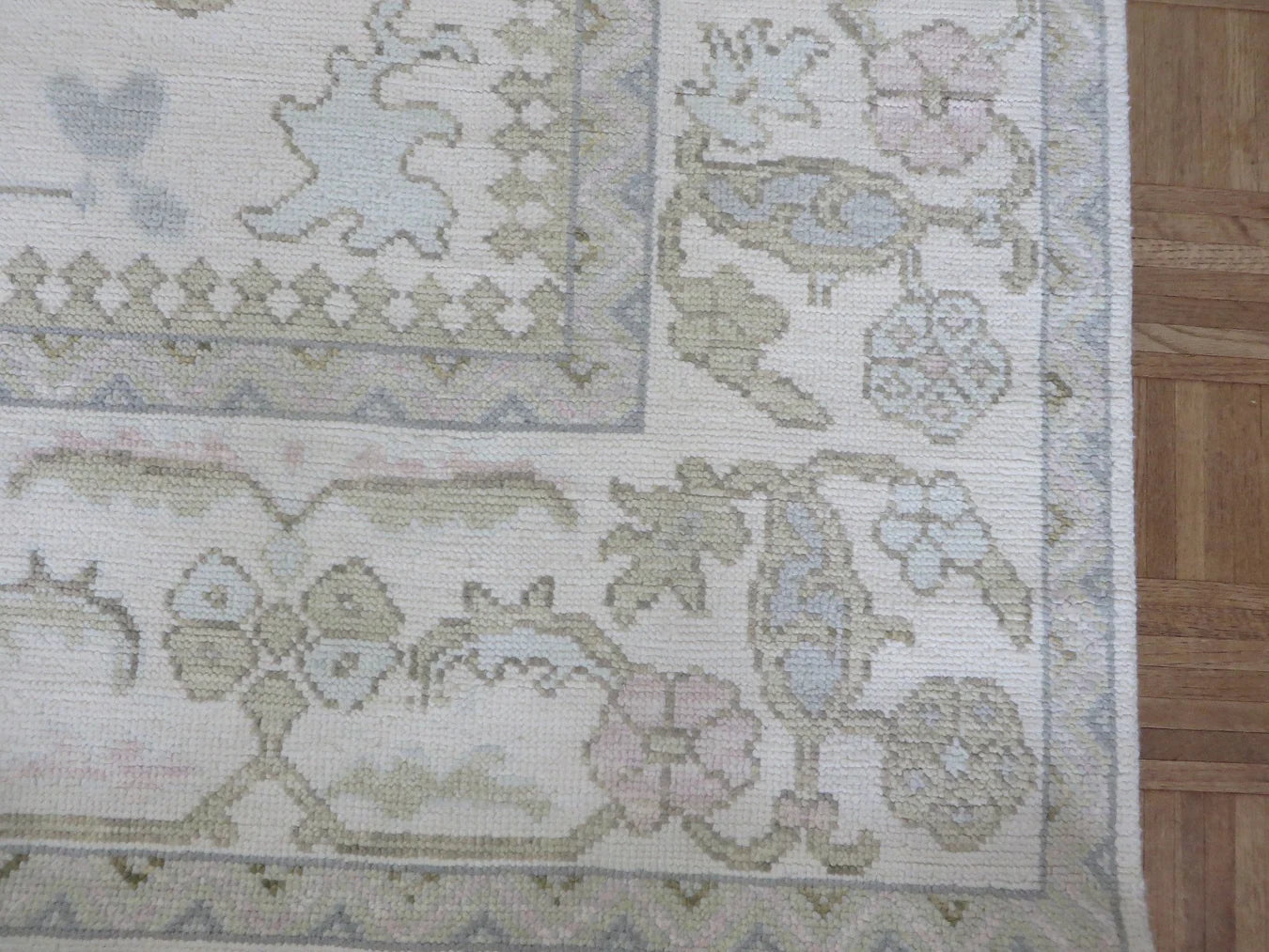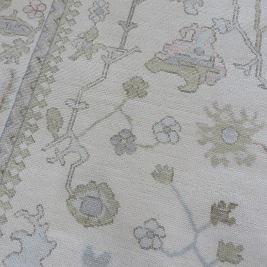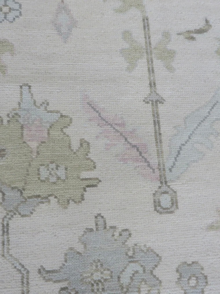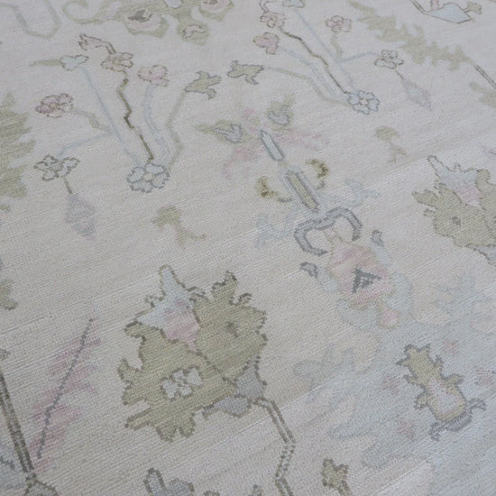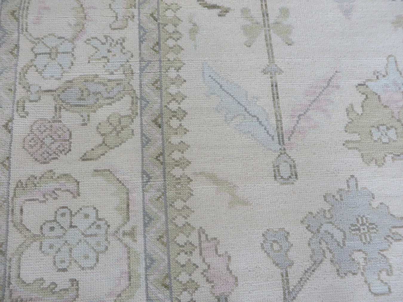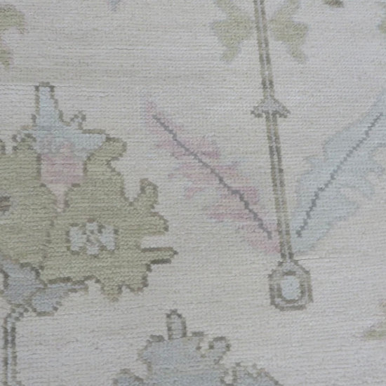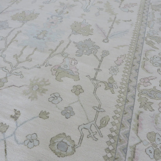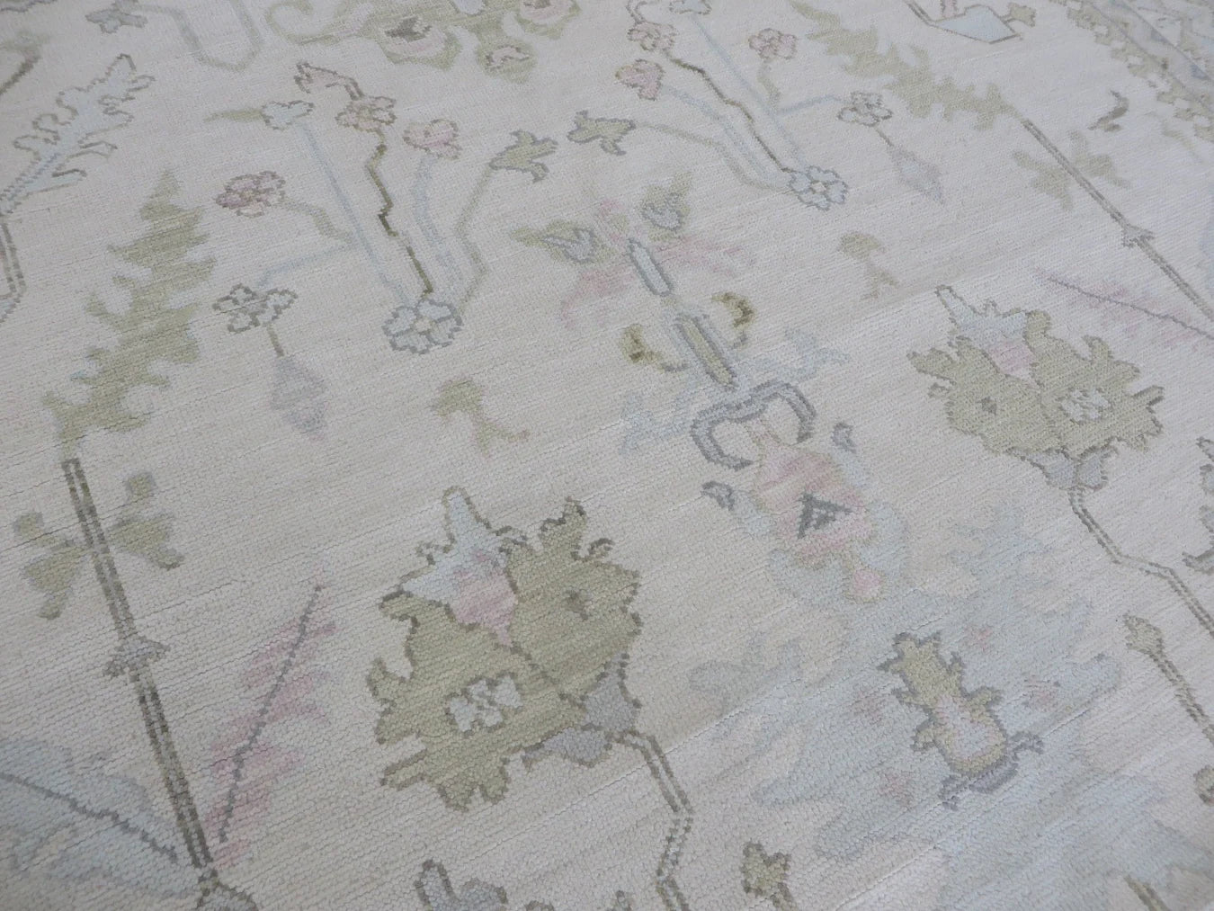 This modern, newly produced hand-knotted Oushak is expertly crafted in India using the Persian knot and composed of 100% hand-spun wool, naturally dyed with vegetable dyes. For custom sizing inquiries, please contact us directly.
