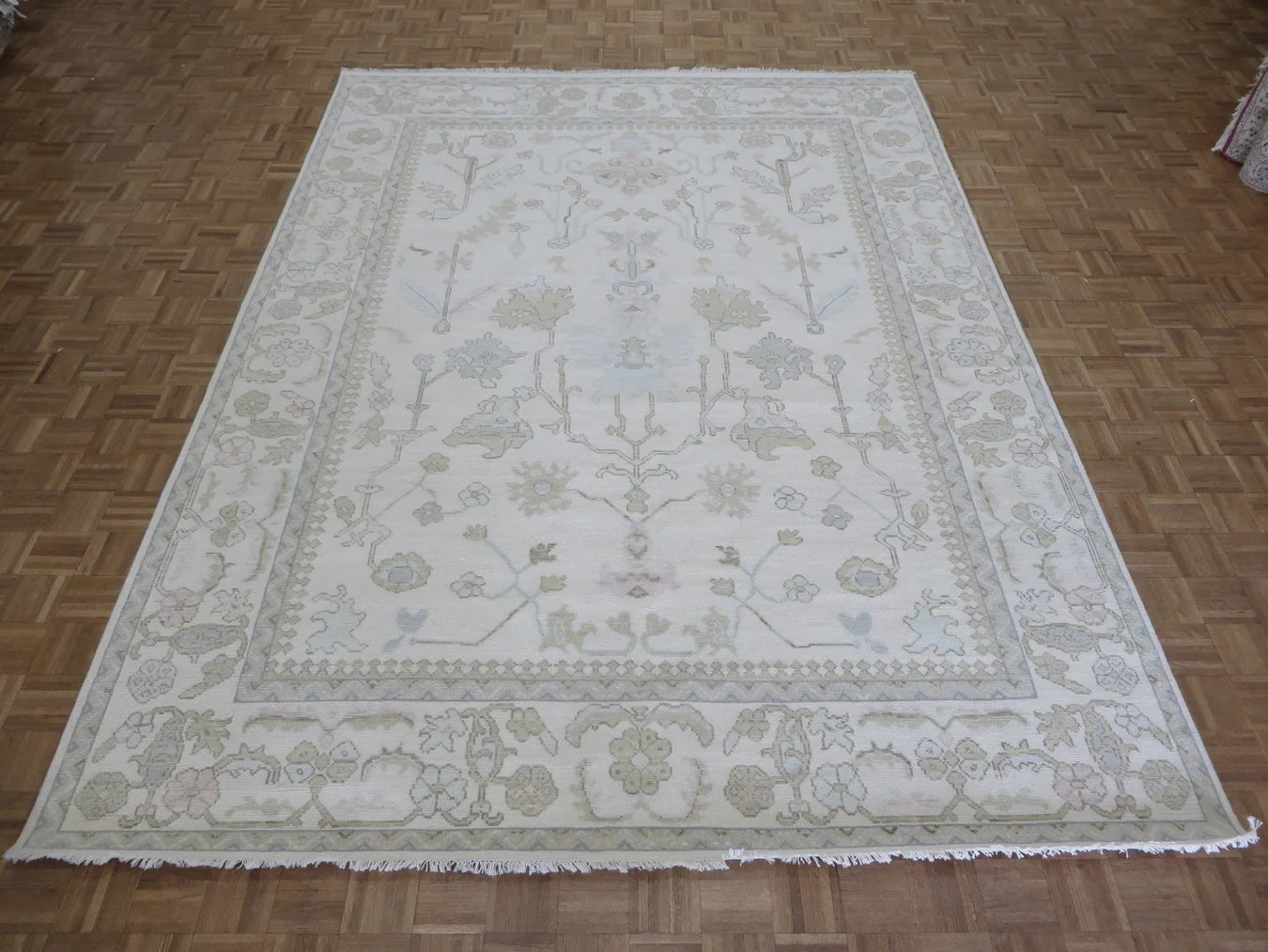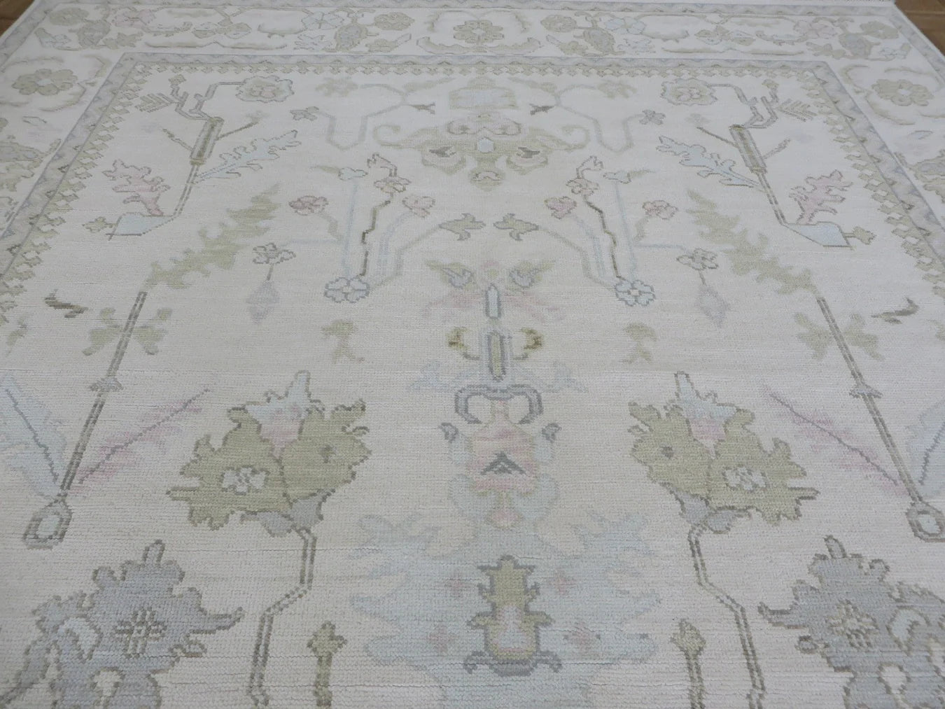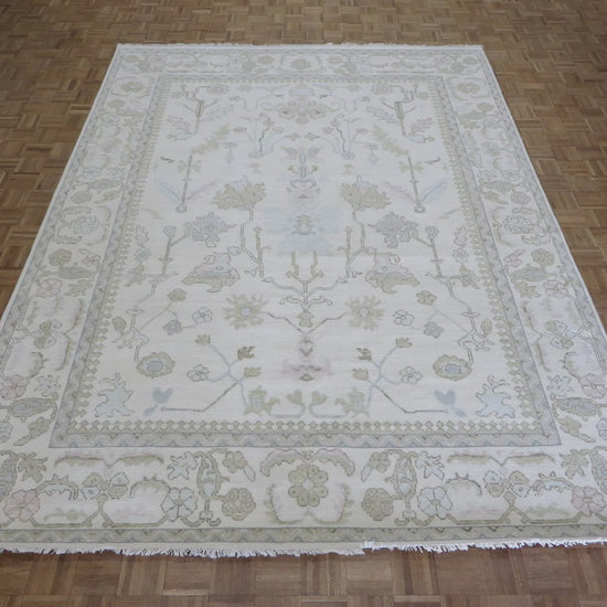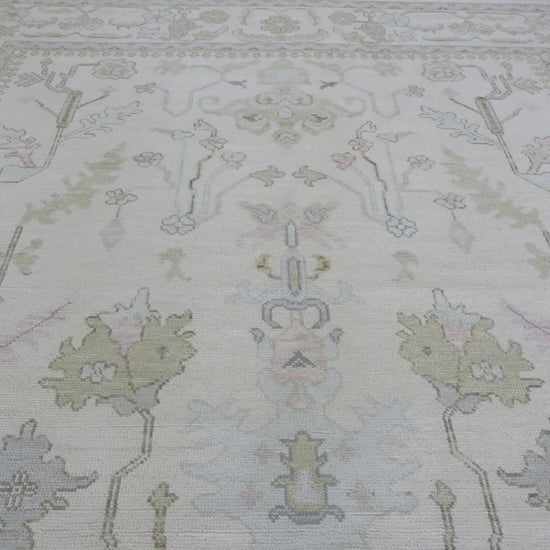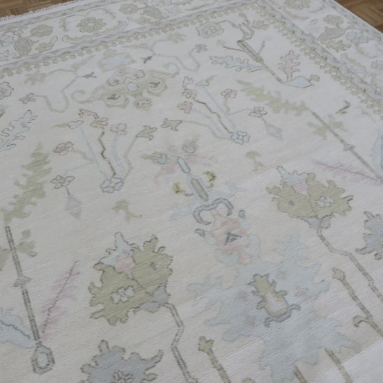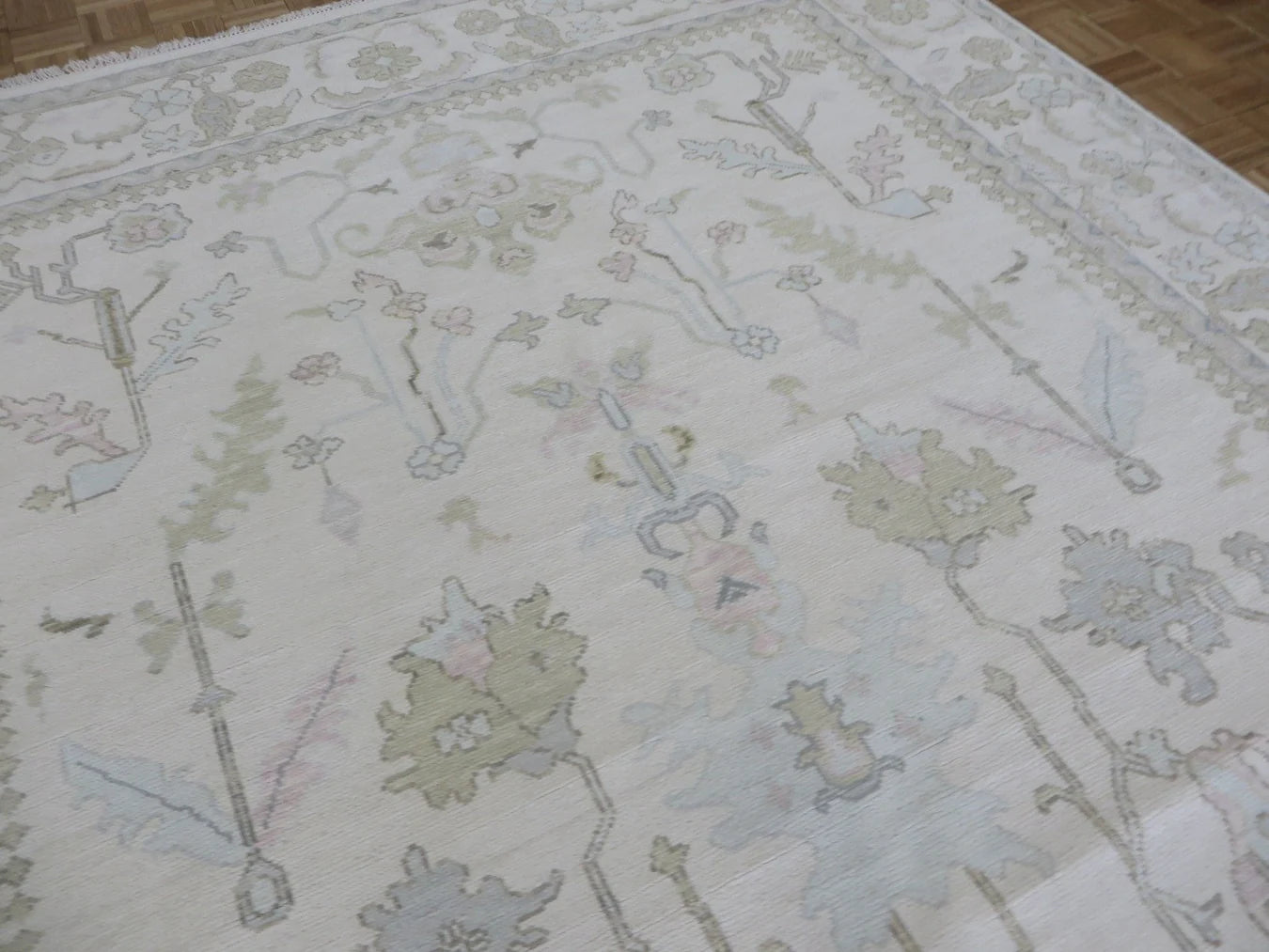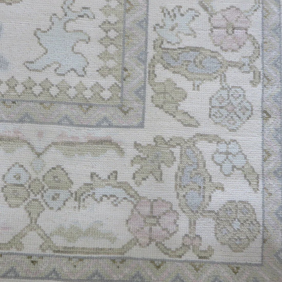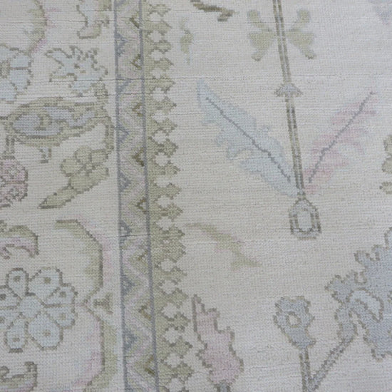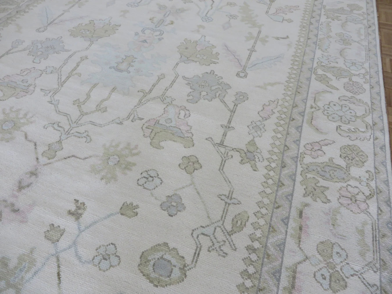This modern, newly produced hand-knotted Oushak is expertly crafted in India using the Persian knot and composed of 100% hand-spun wool, naturally dyed with vegetable dyes. For custom sizing inquiries, please contact us directly.