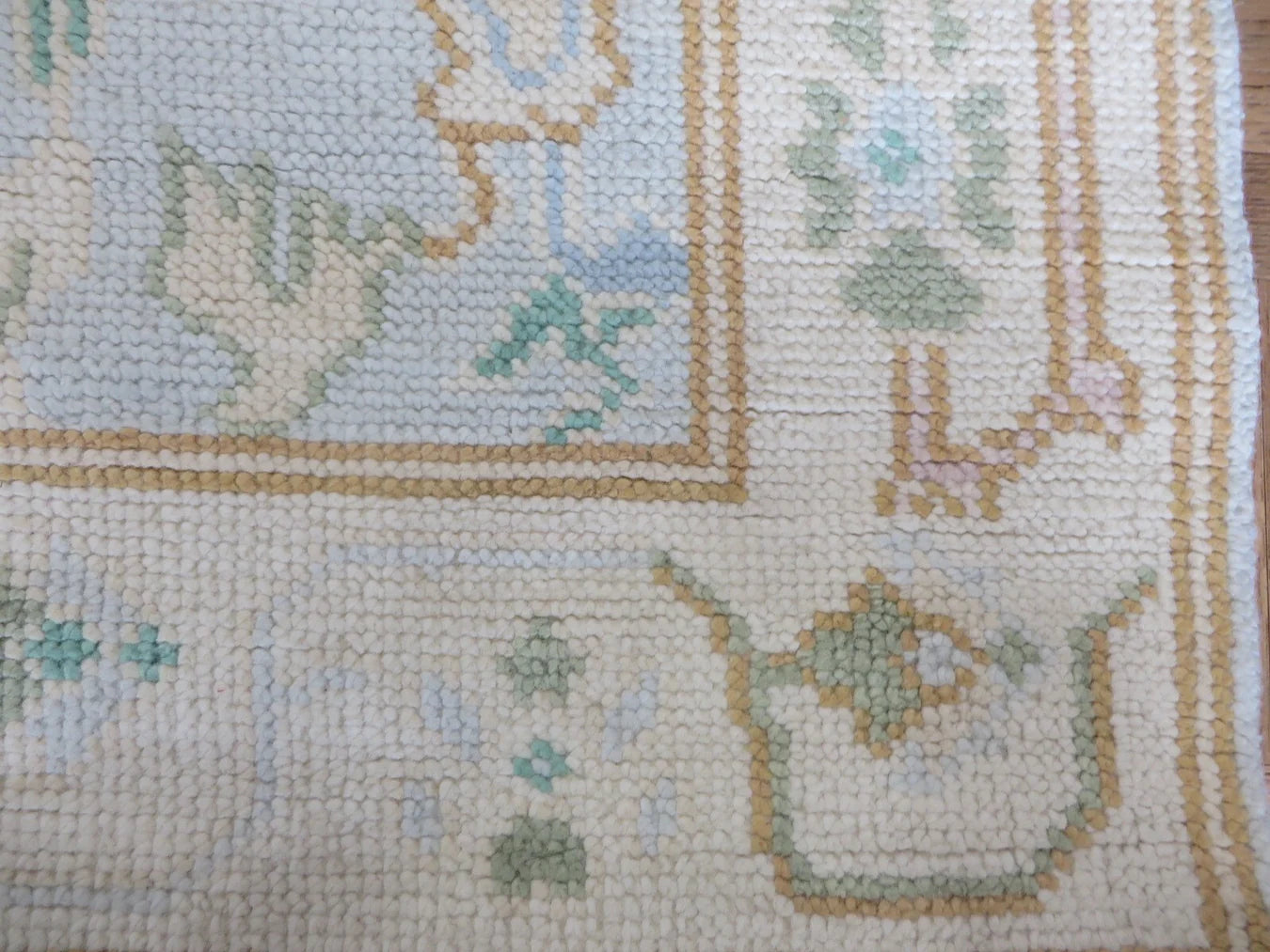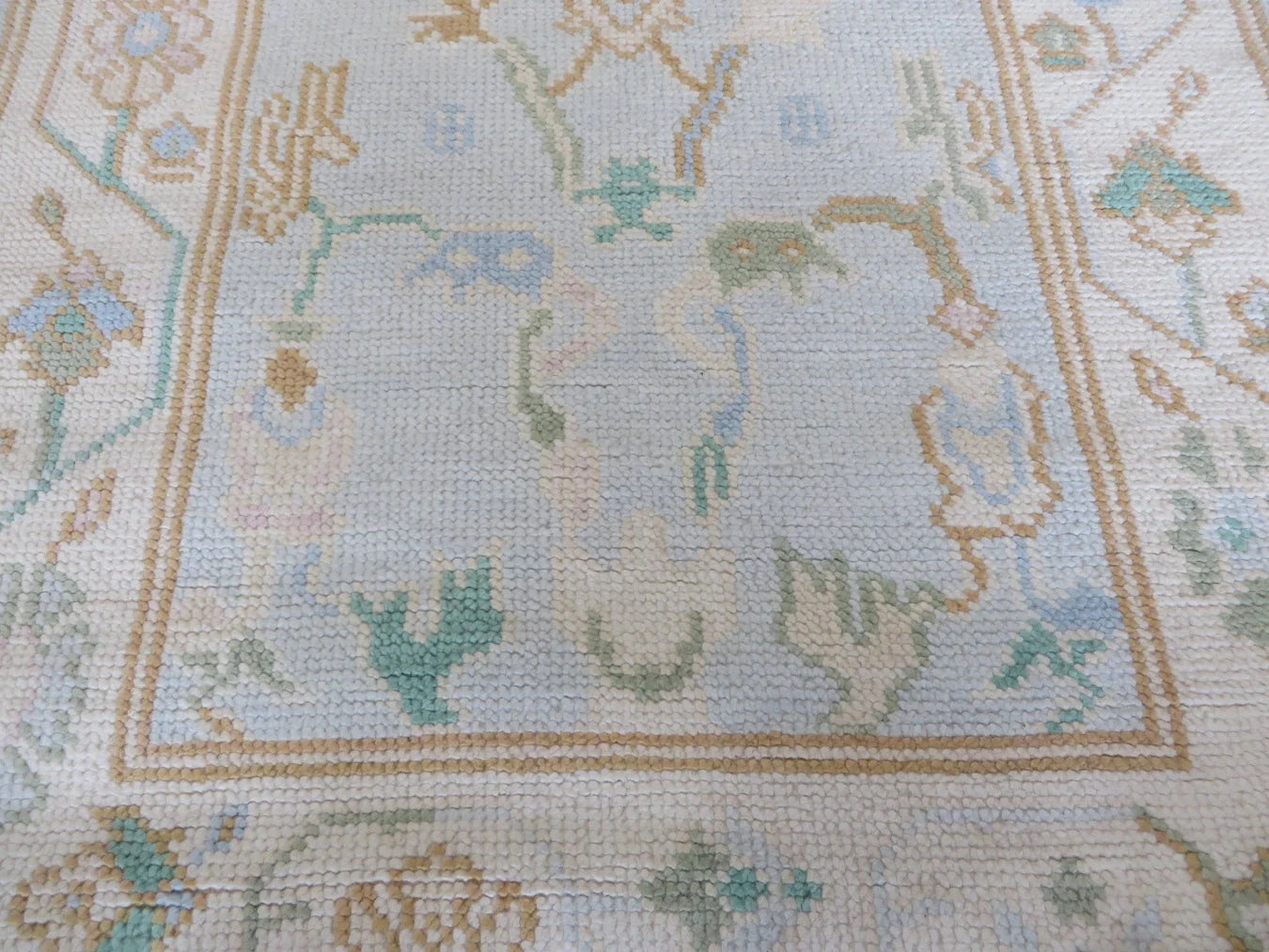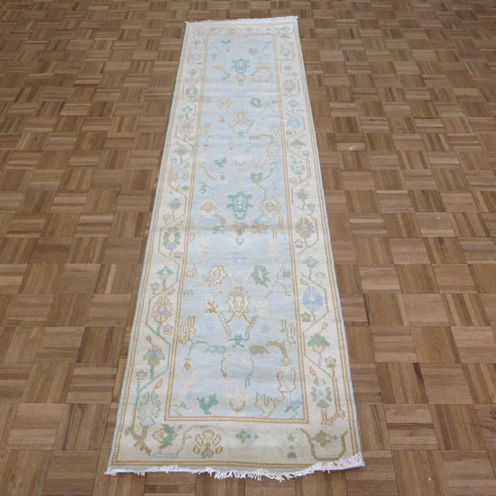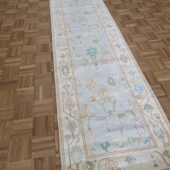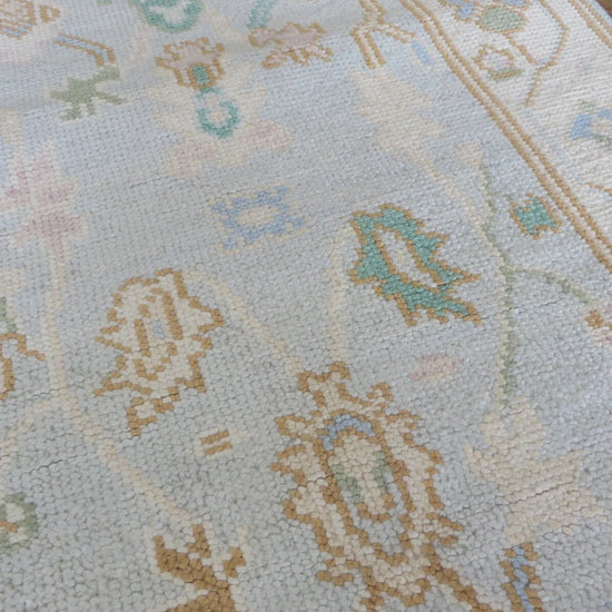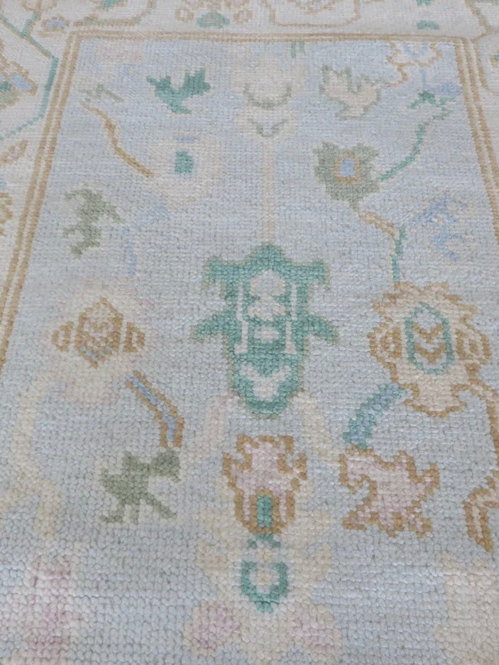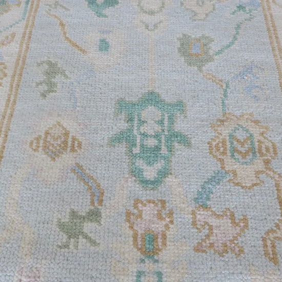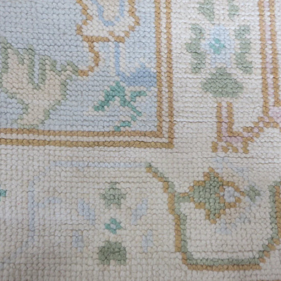 This modern, newly produced hand-knotted Oushak is expertly crafted in India using the Persian knot and composed of 100% hand-spun wool, naturally dyed with vegetable dyes. For custom sizing inquiries, please contact us directly.