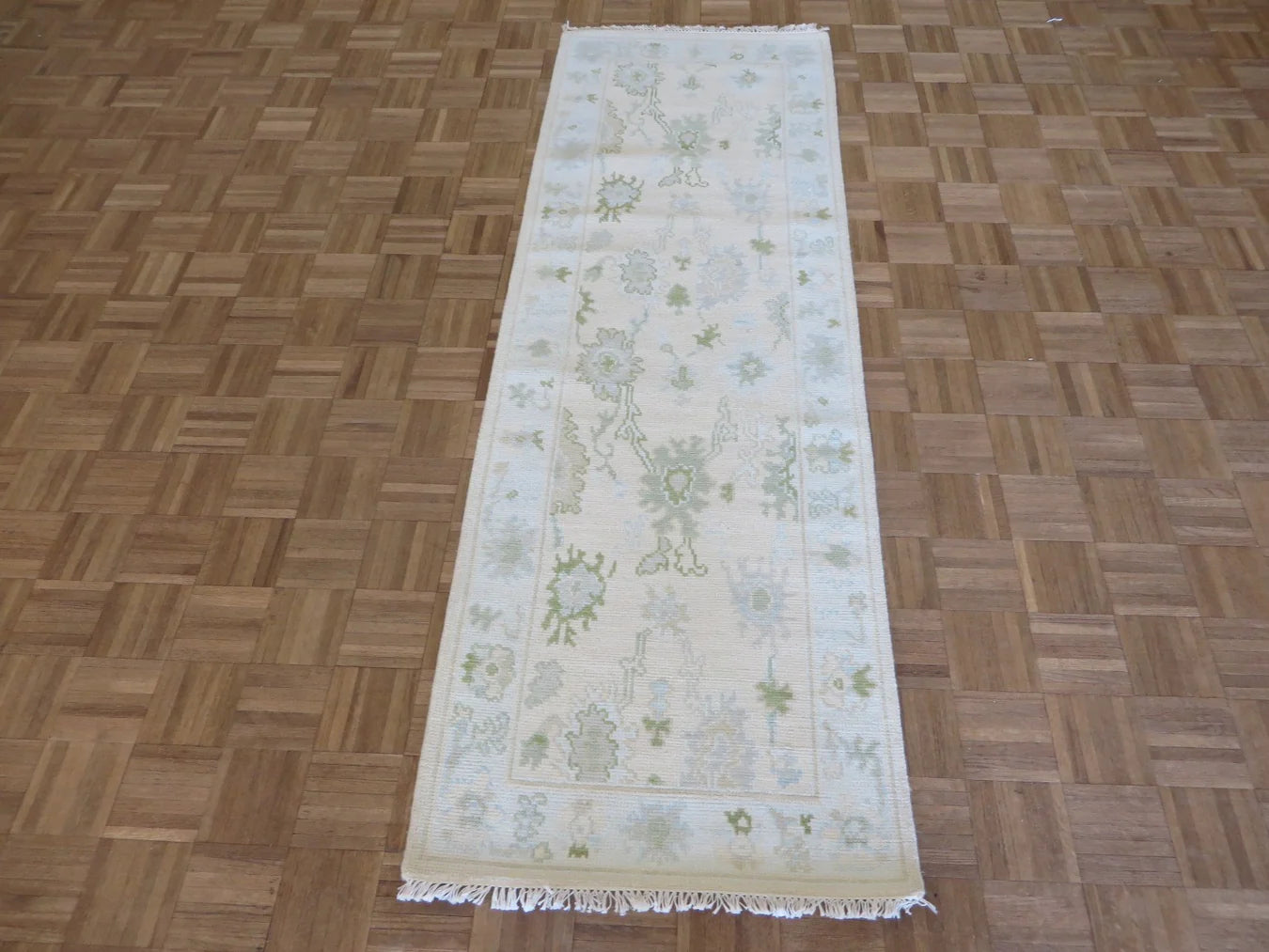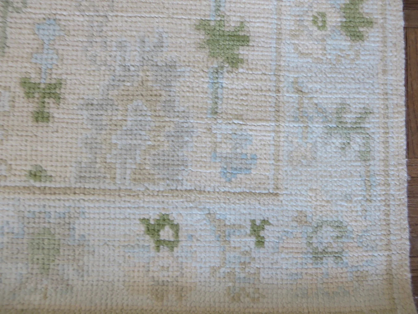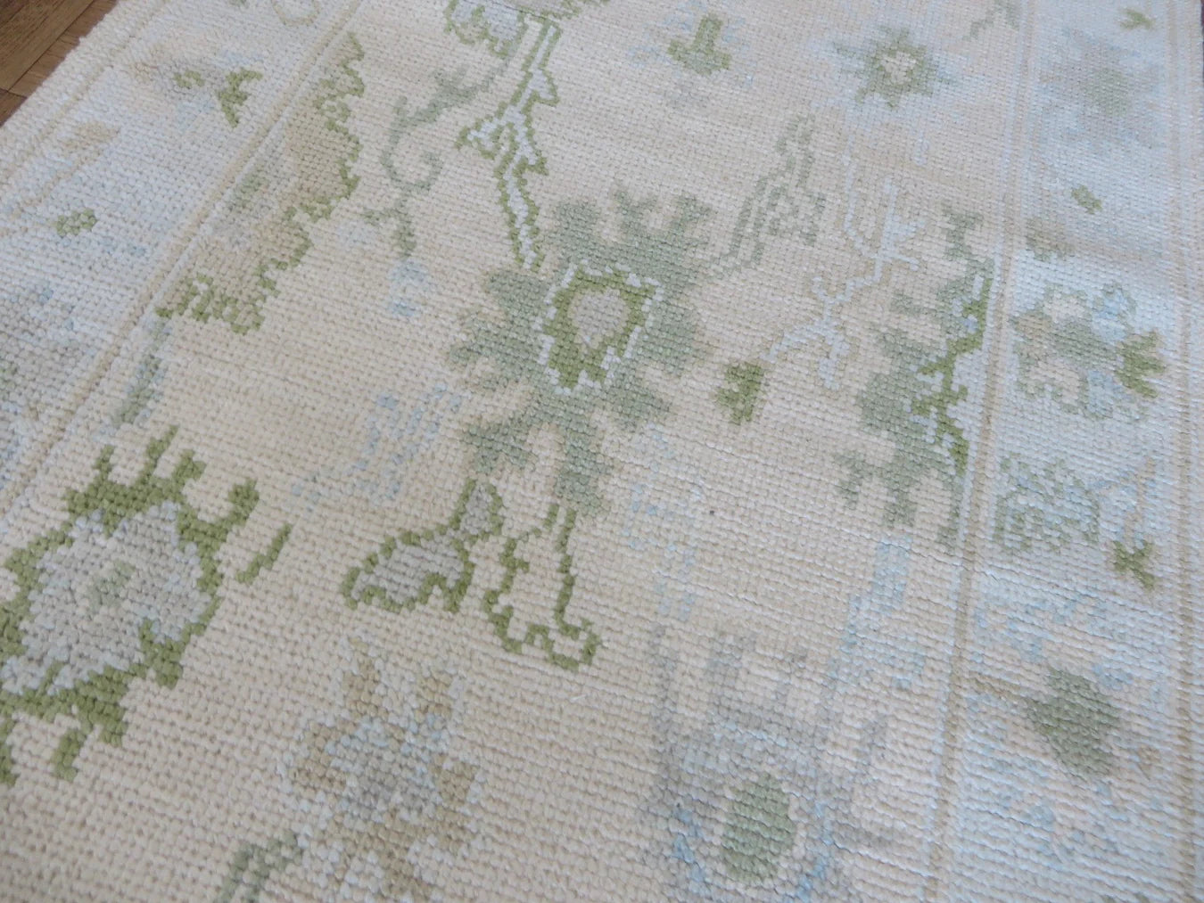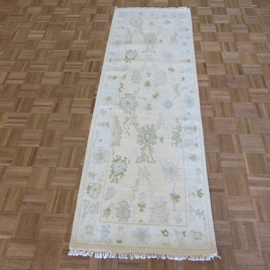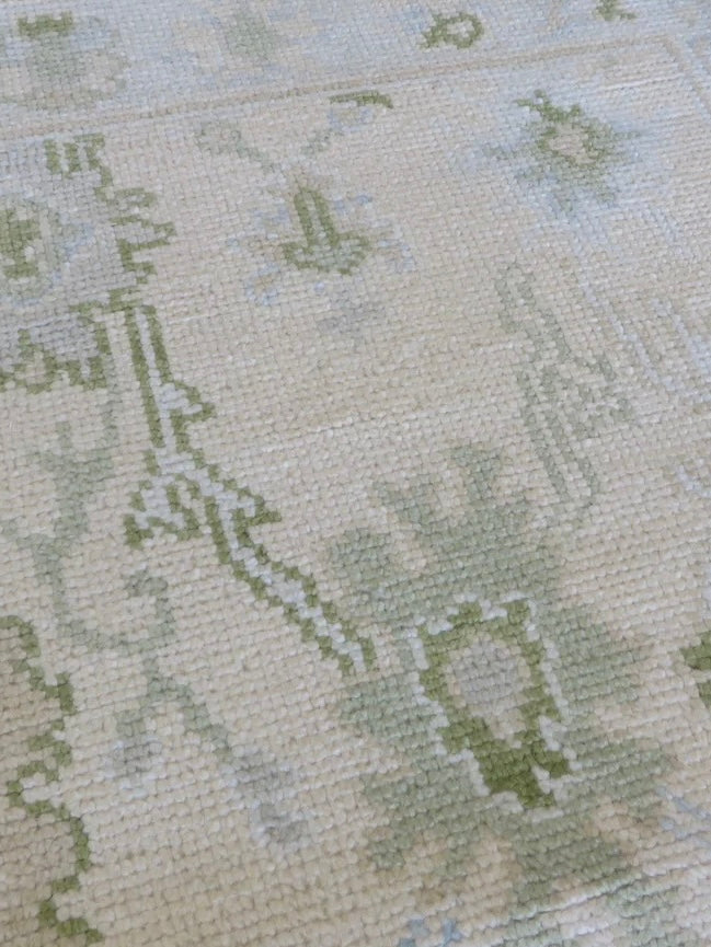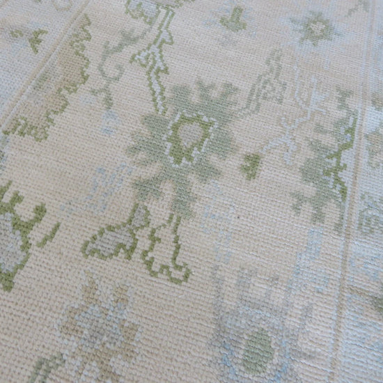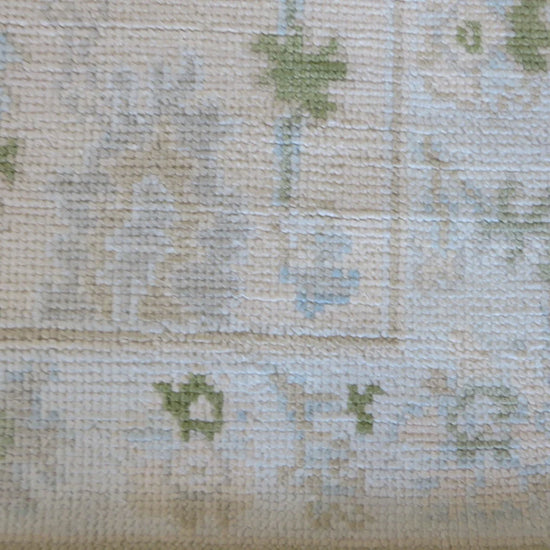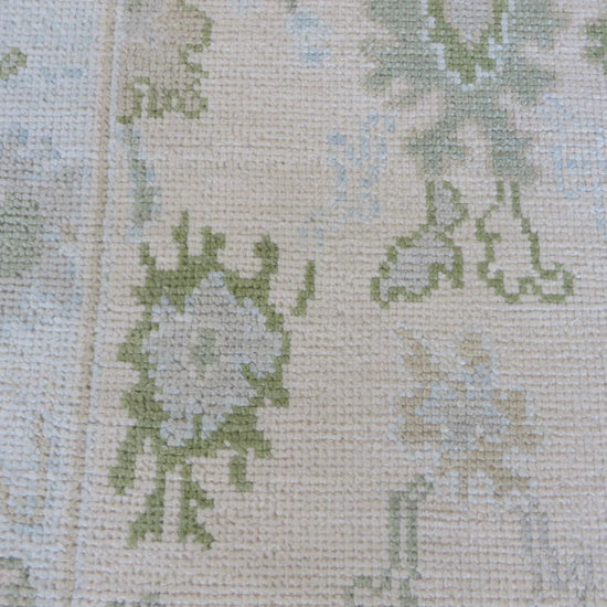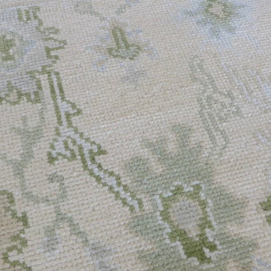 This modern, newly produced hand-knotted Oushak is expertly crafted in India using the Persian knot and composed of 100% hand-spun wool, naturally dyed with vegetable dyes. For custom sizing inquiries, please contact us directly.