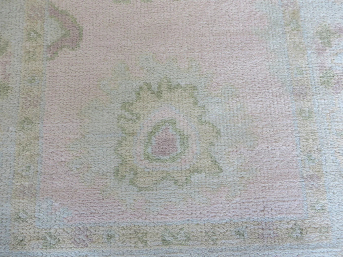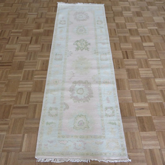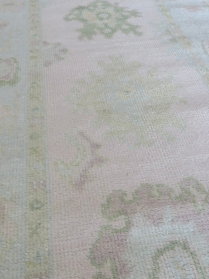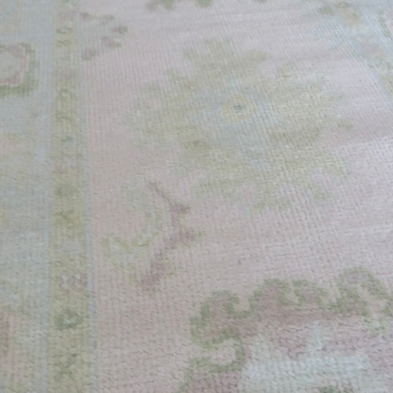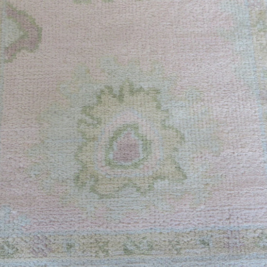 This modern, newly produced hand-knotted Oushak is expertly crafted in India using the Persian knot and composed of 100% hand-spun wool, naturally dyed with vegetable dyes. For custom sizing inquiries, please contact us directly.