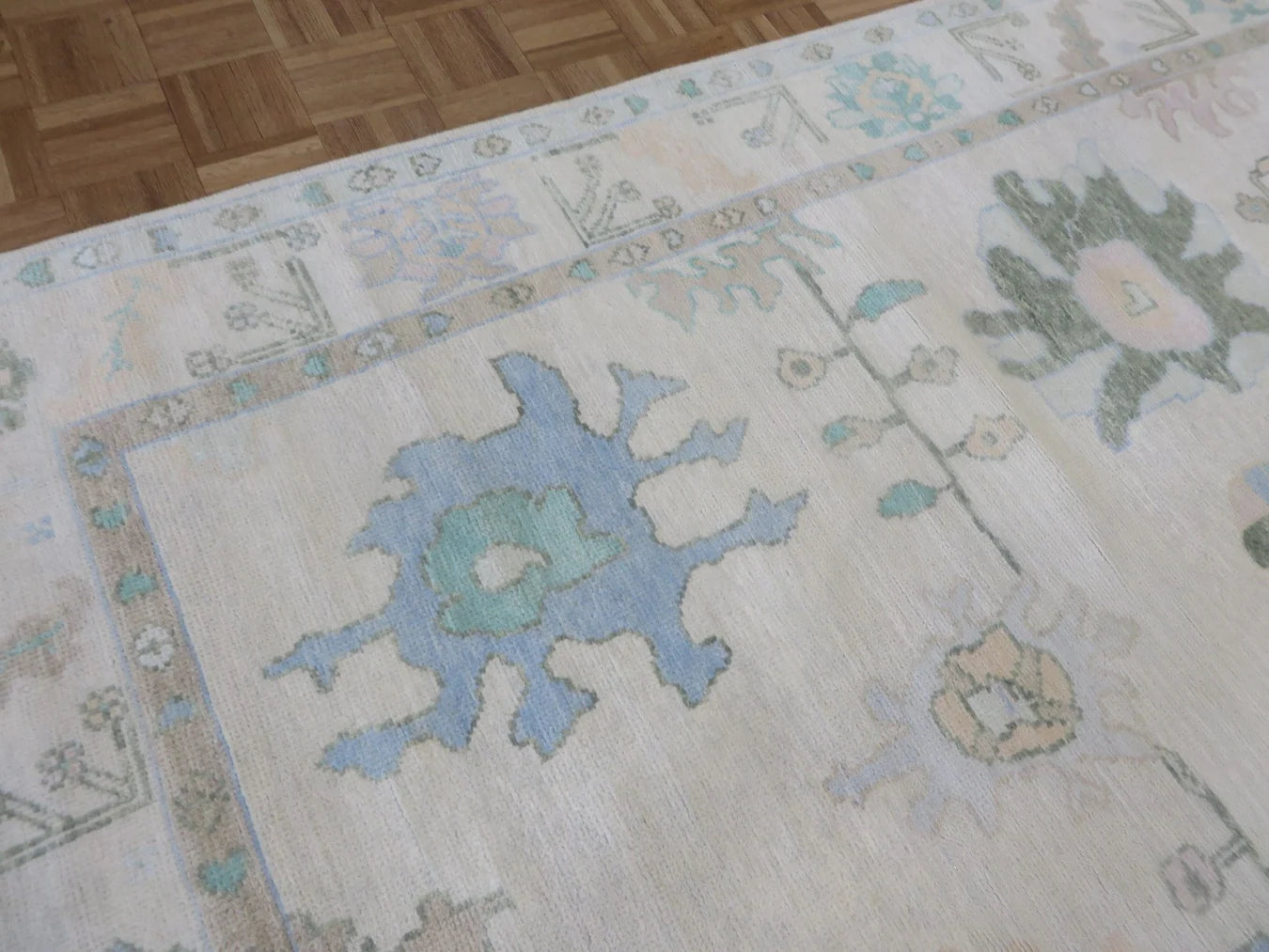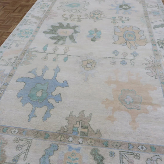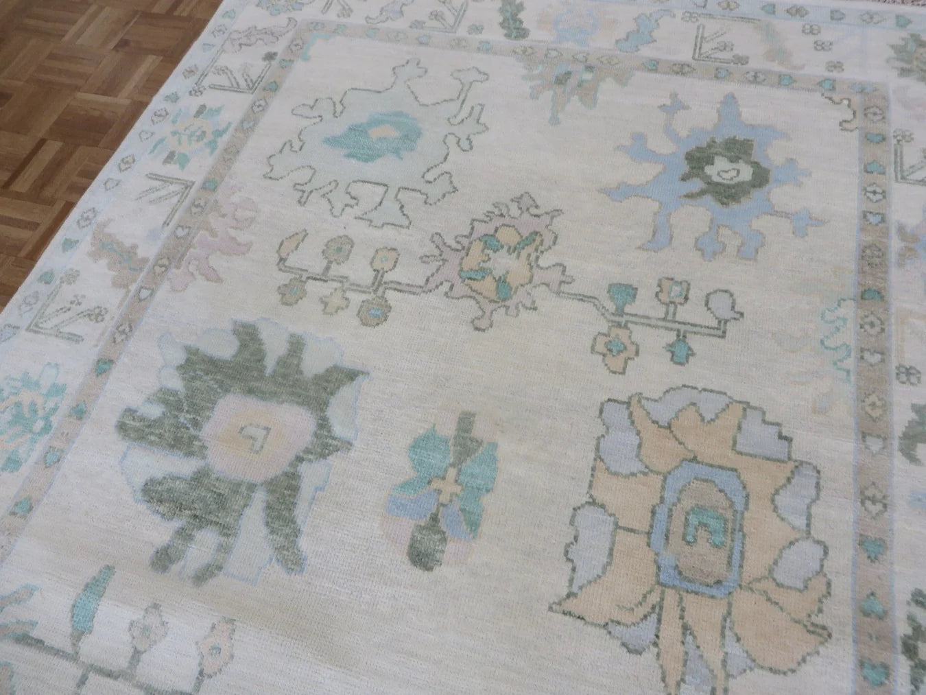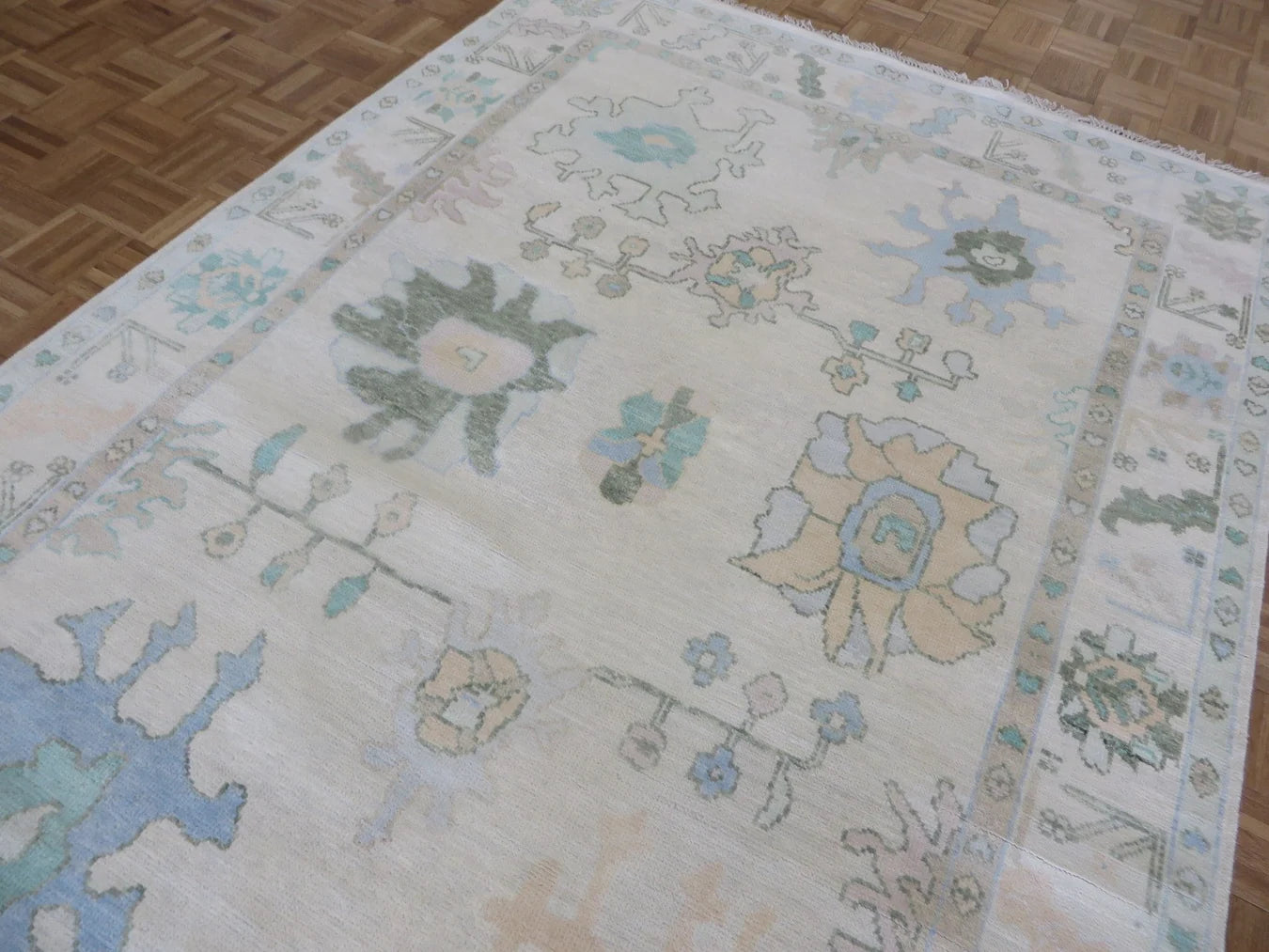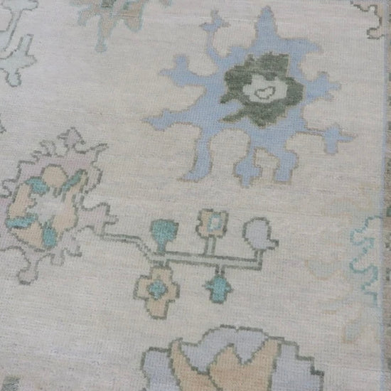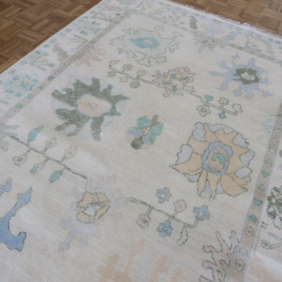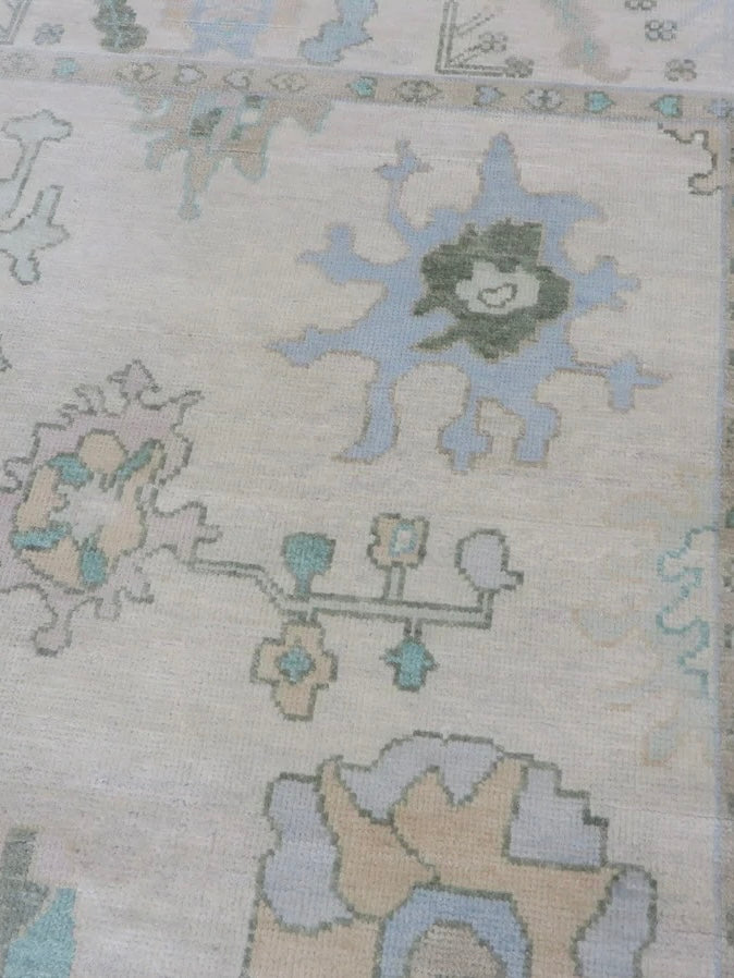 This modern, newly produced hand-knotted Oushak is expertly crafted in India using the Persian knot and composed of 100% hand-spun wool, naturally dyed with vegetable dyes. For custom sizing inquiries, please contact us directly.