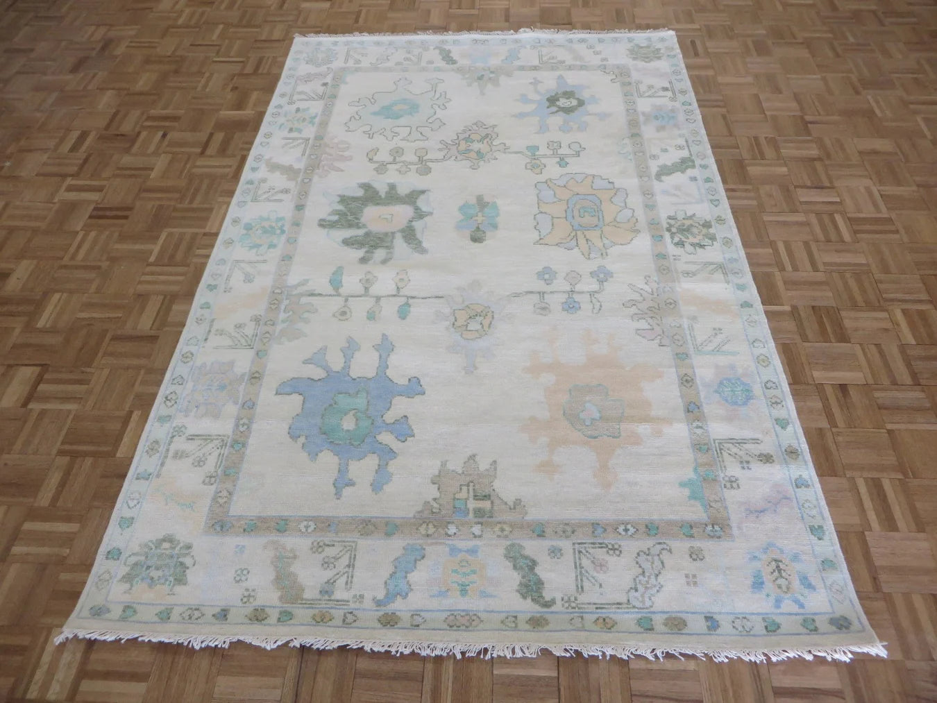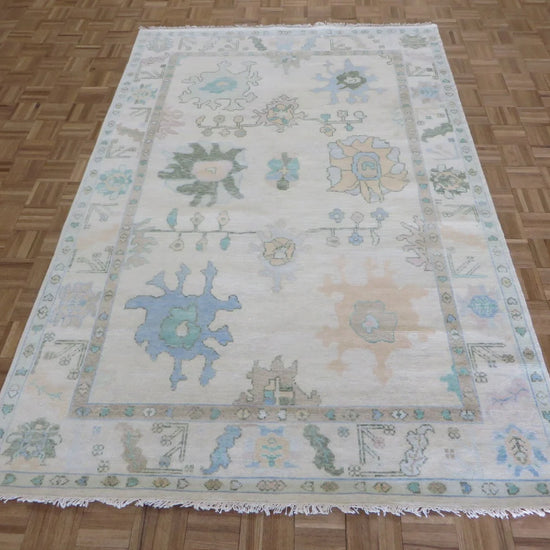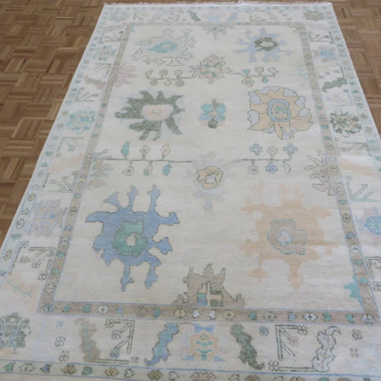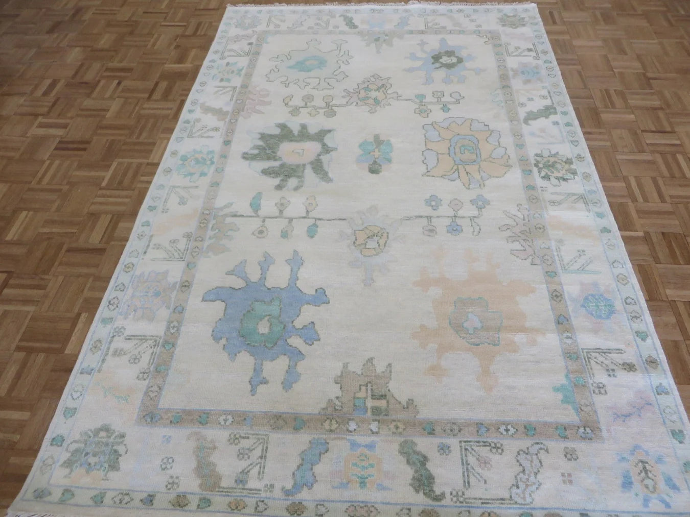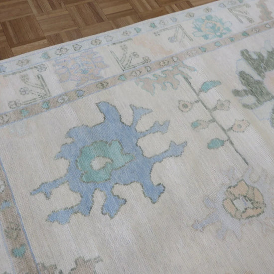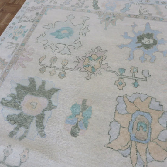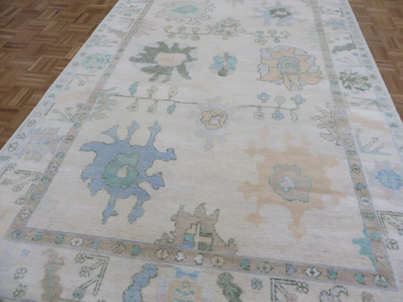 This modern, newly produced hand-knotted Oushak is expertly crafted in India using the Persian knot and composed of 100% hand-spun wool, naturally dyed with vegetable dyes. For custom sizing inquiries, please contact us directly.