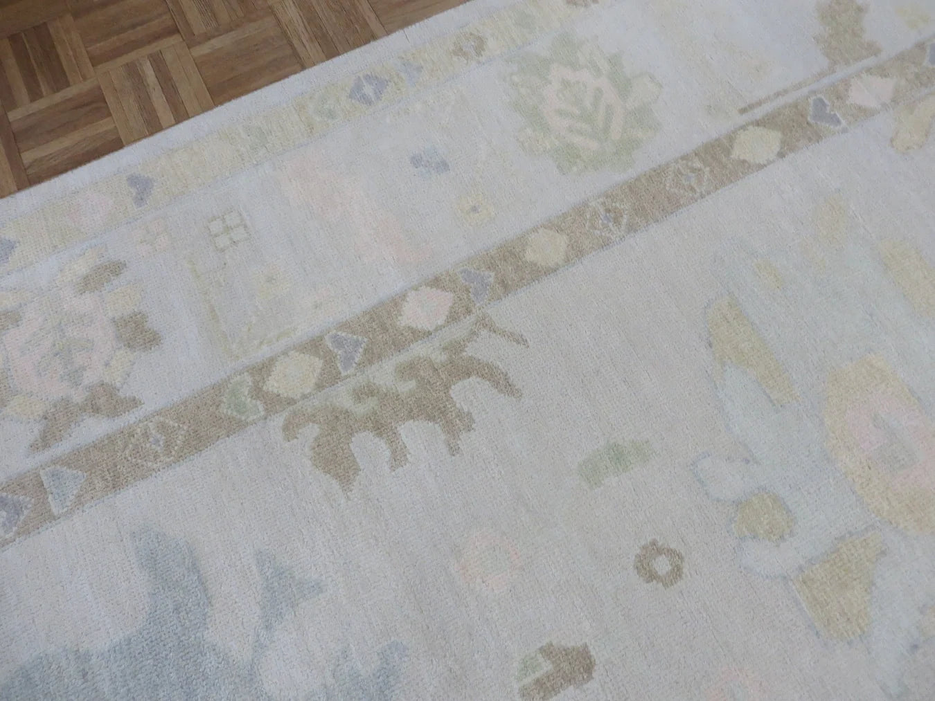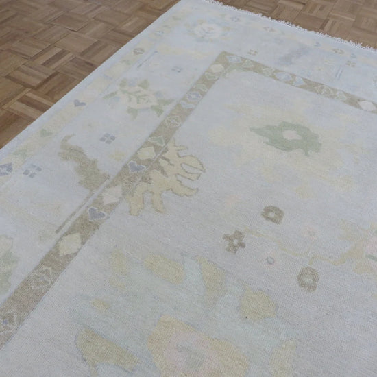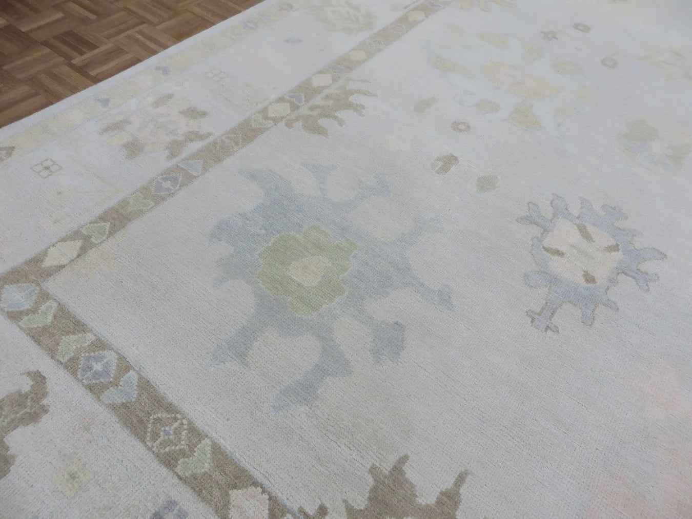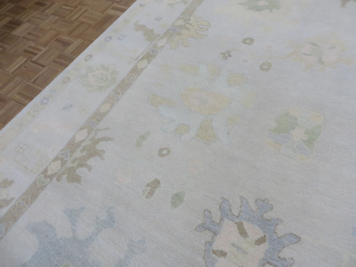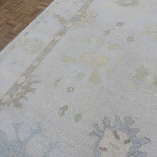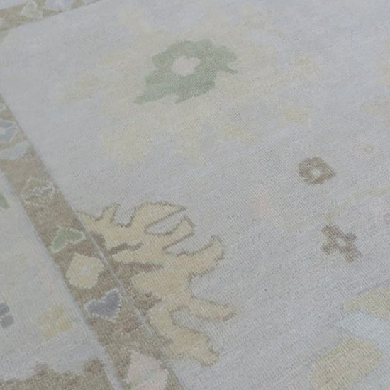 This modern, newly produced hand-knotted Oushak is expertly crafted in India using the Persian knot and composed of 100% hand-spun wool, naturally dyed with vegetable dyes. For custom sizing inquiries, please contact us directly.