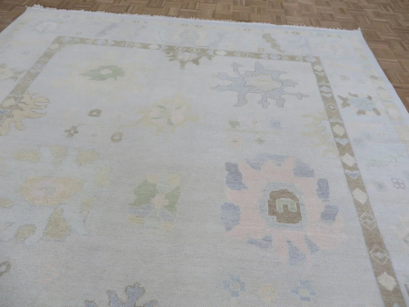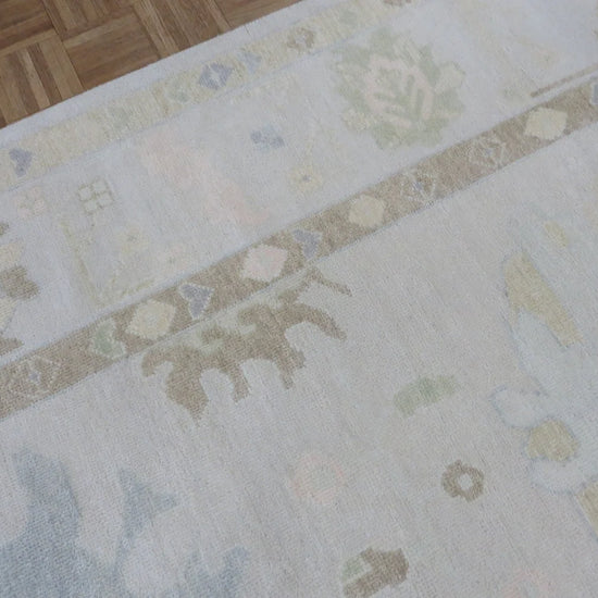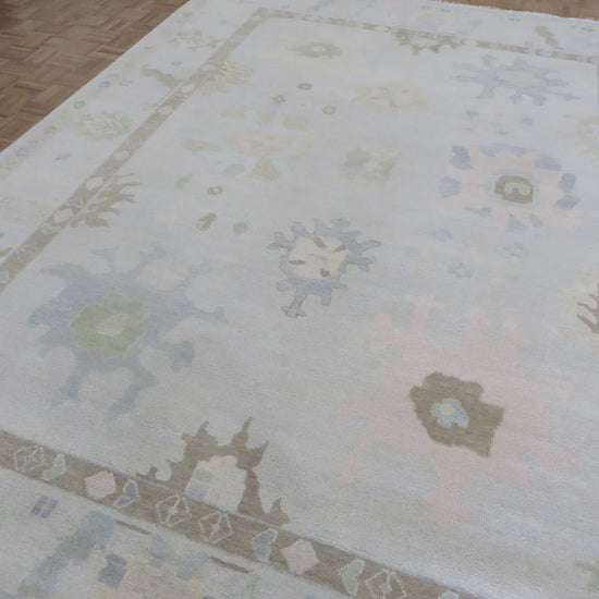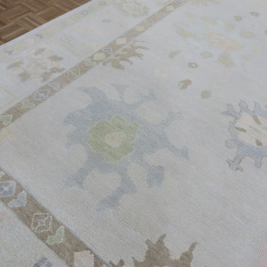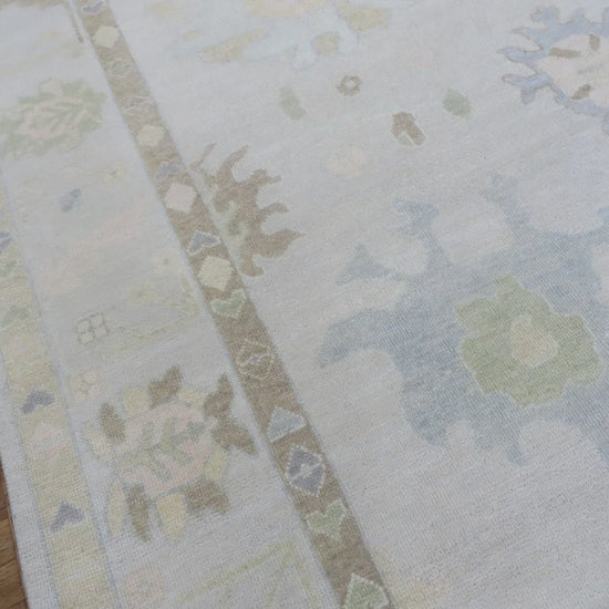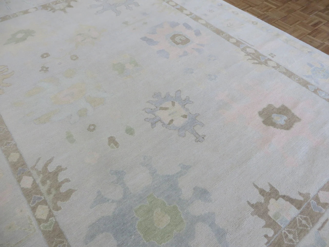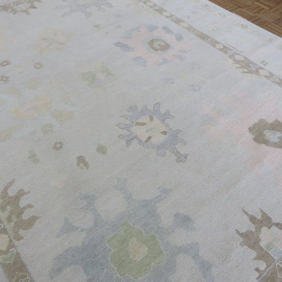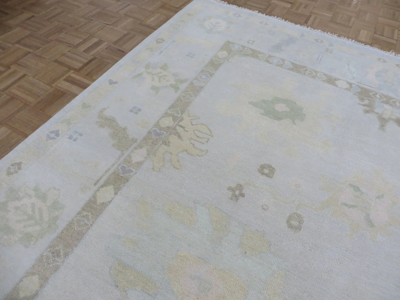 This modern, newly produced hand-knotted Oushak is expertly crafted in India using the Persian knot and composed of 100% hand-spun wool, naturally dyed with vegetable dyes. For custom sizing inquiries, please contact us directly.