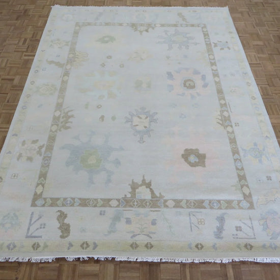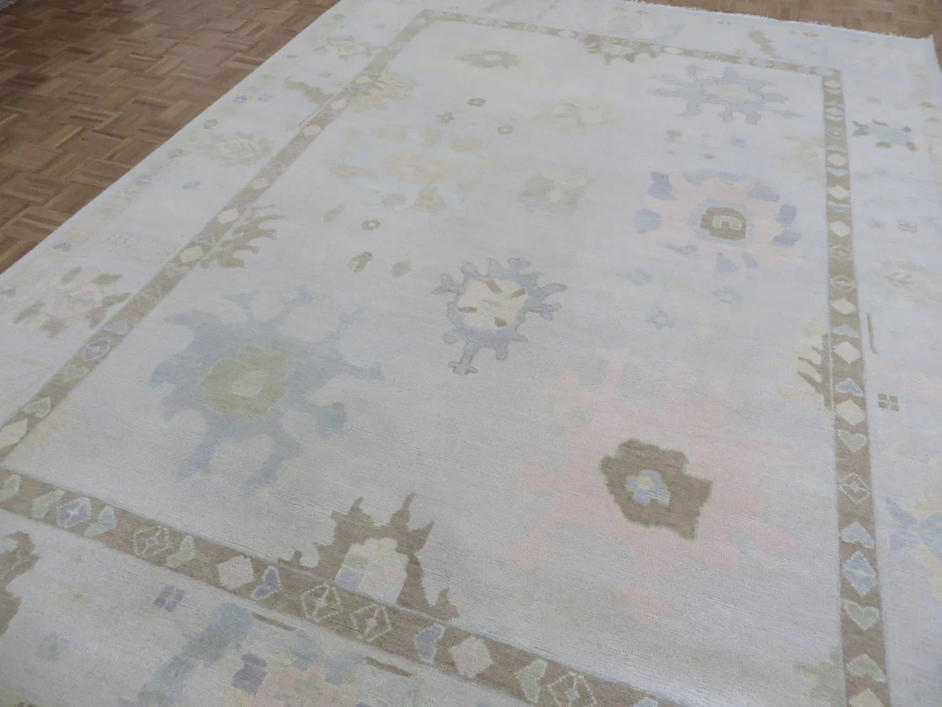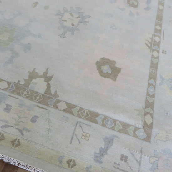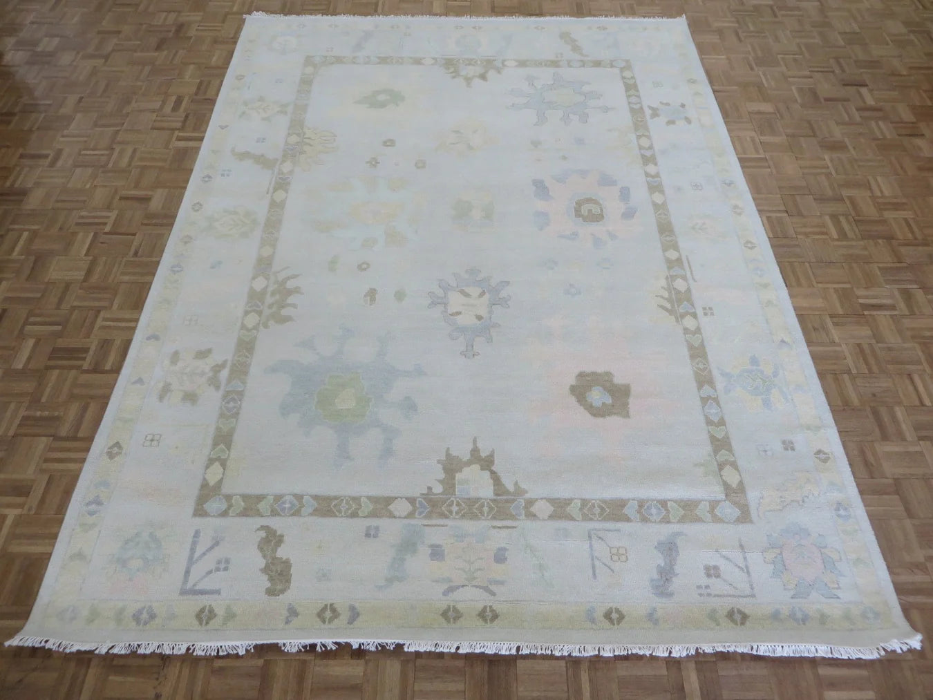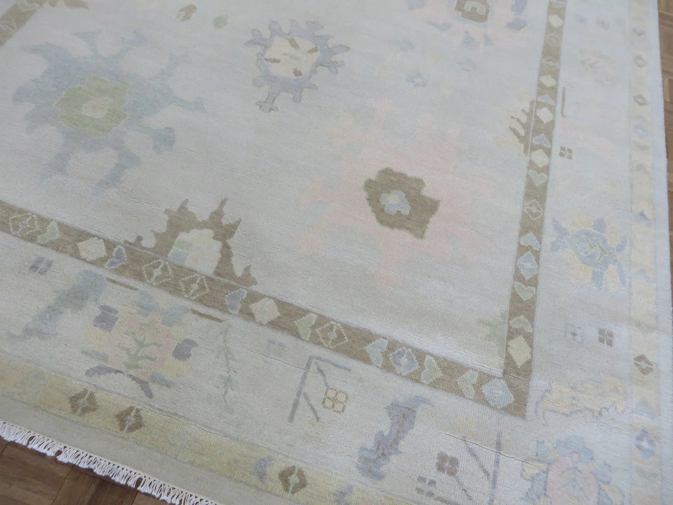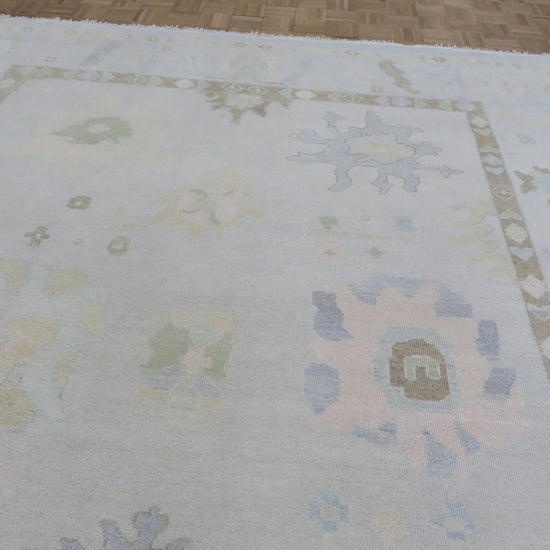 This modern, newly produced hand-knotted Oushak is expertly crafted in India using the Persian knot and composed of 100% hand-spun wool, naturally dyed with vegetable dyes. For custom sizing inquiries, please contact us directly.