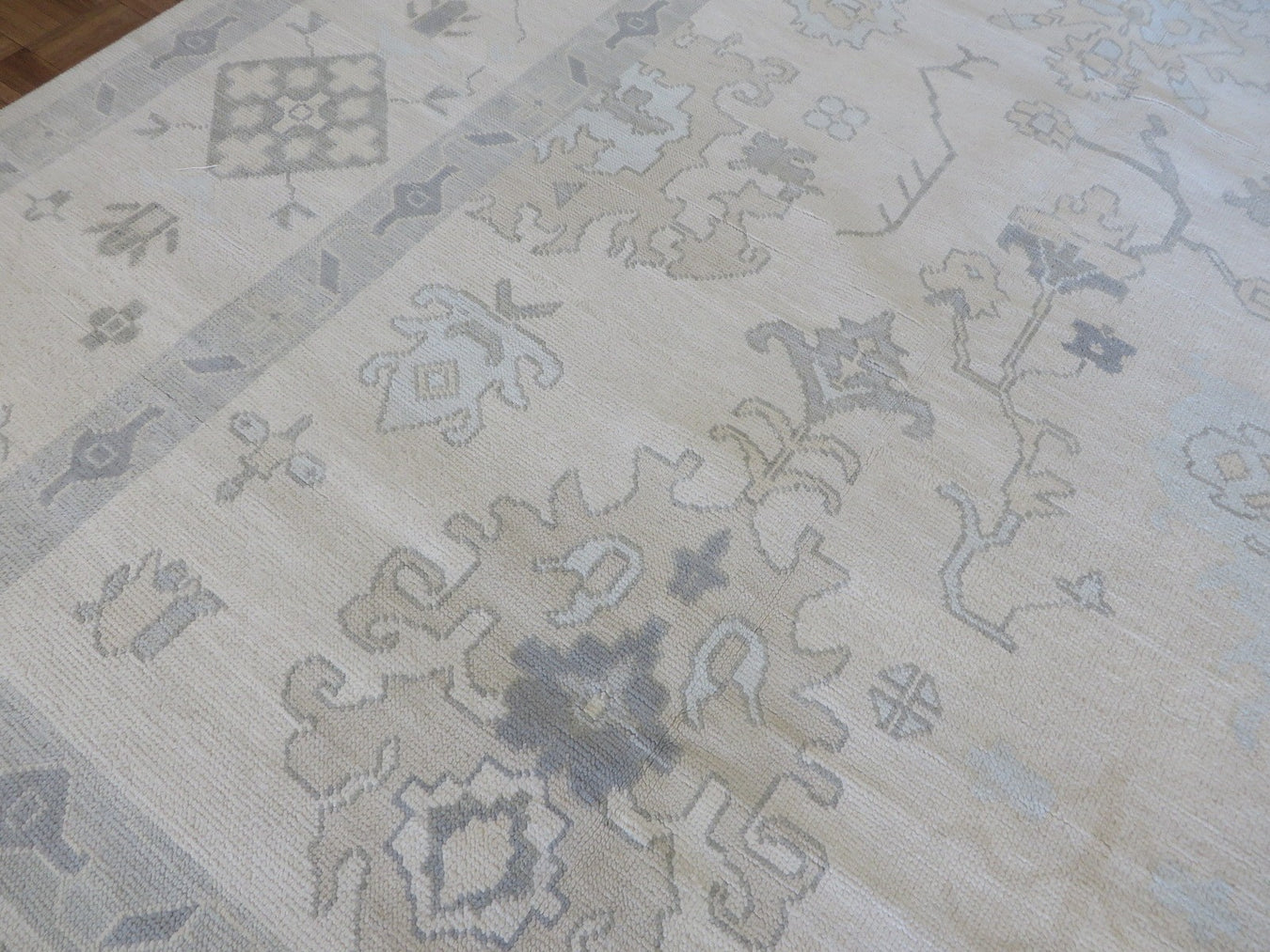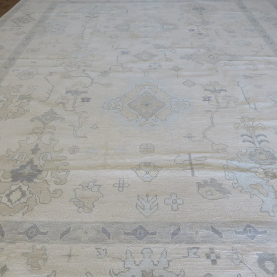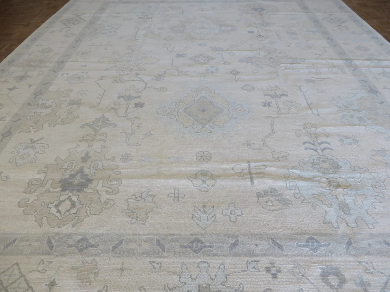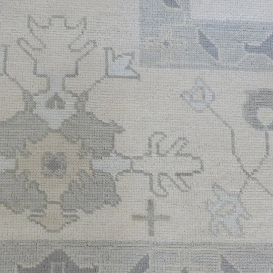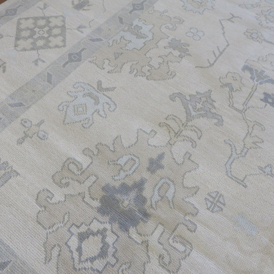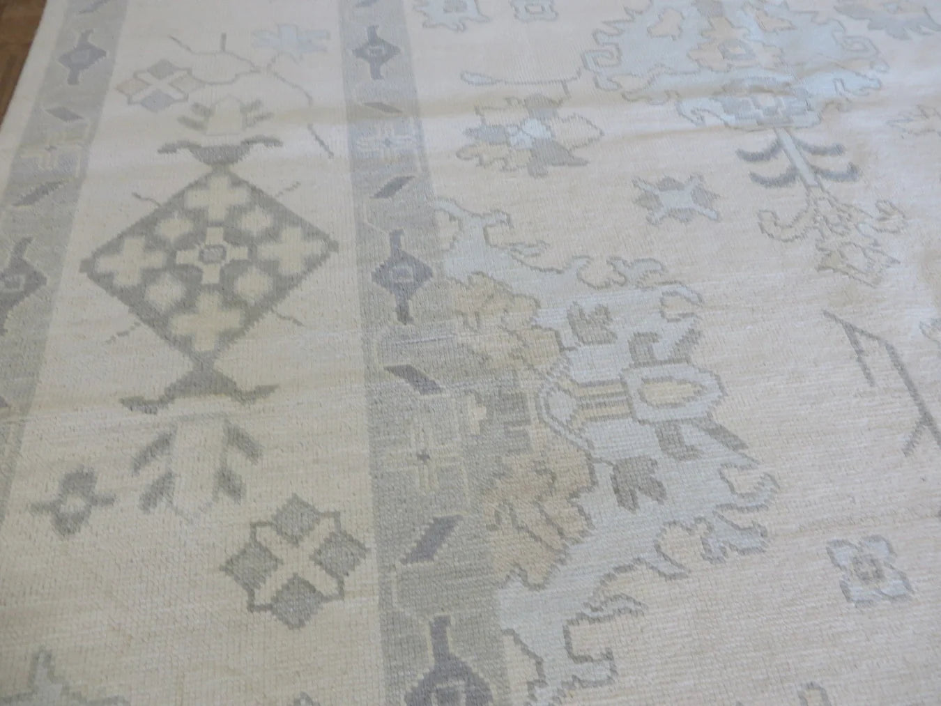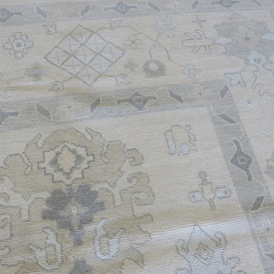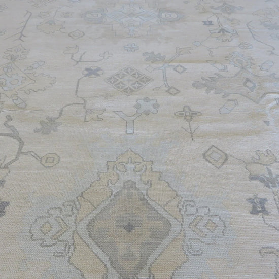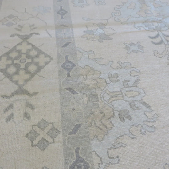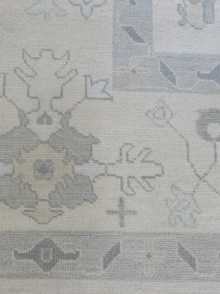 This modern, newly produced hand-knotted Oushak is expertly crafted in India using the Persian knot and composed of 100% hand-spun wool, naturally dyed with vegetable dyes. For custom sizing inquiries, please contact us directly.