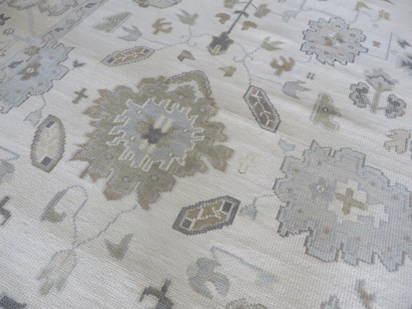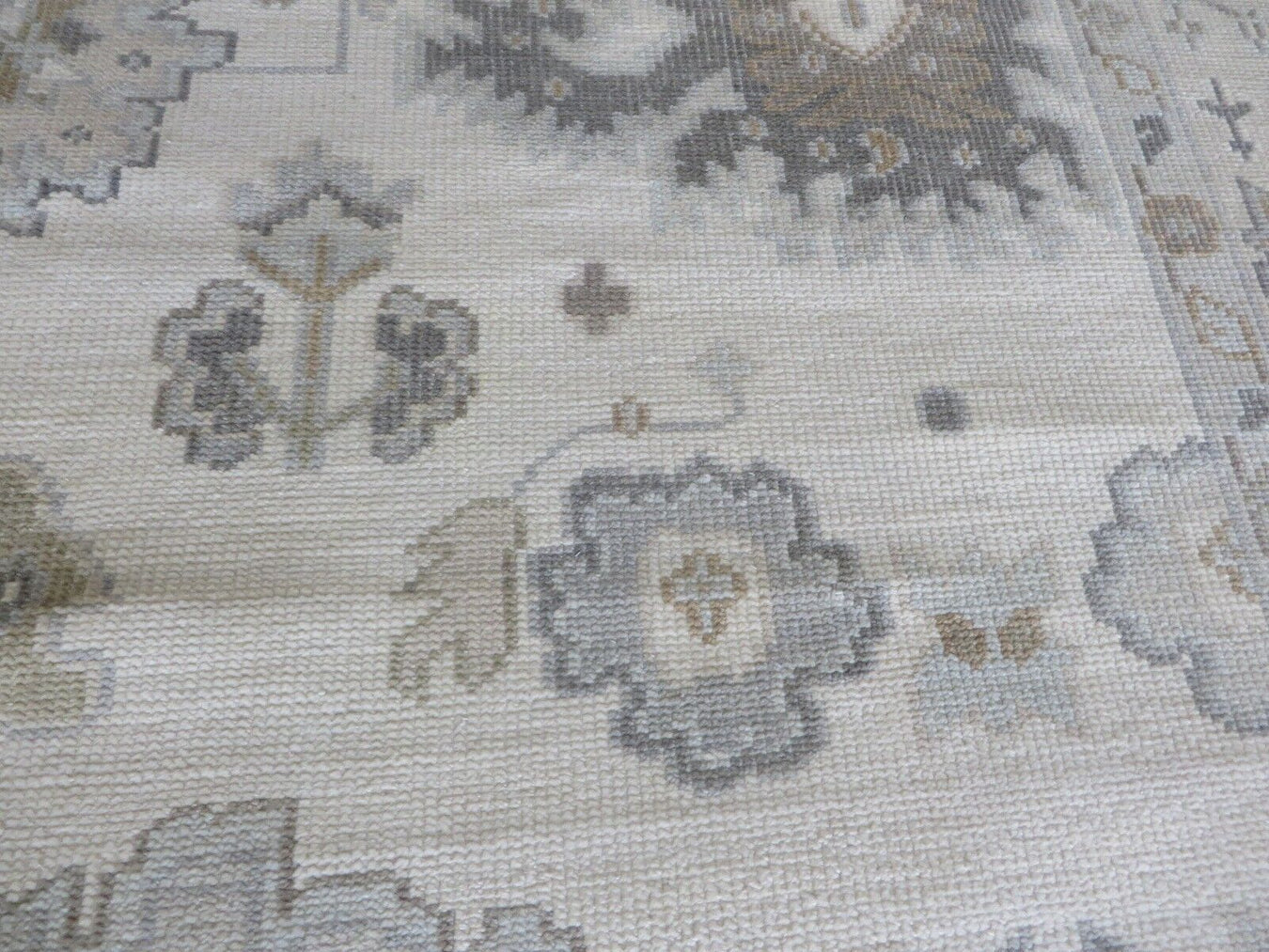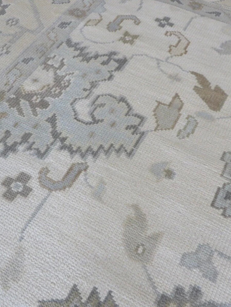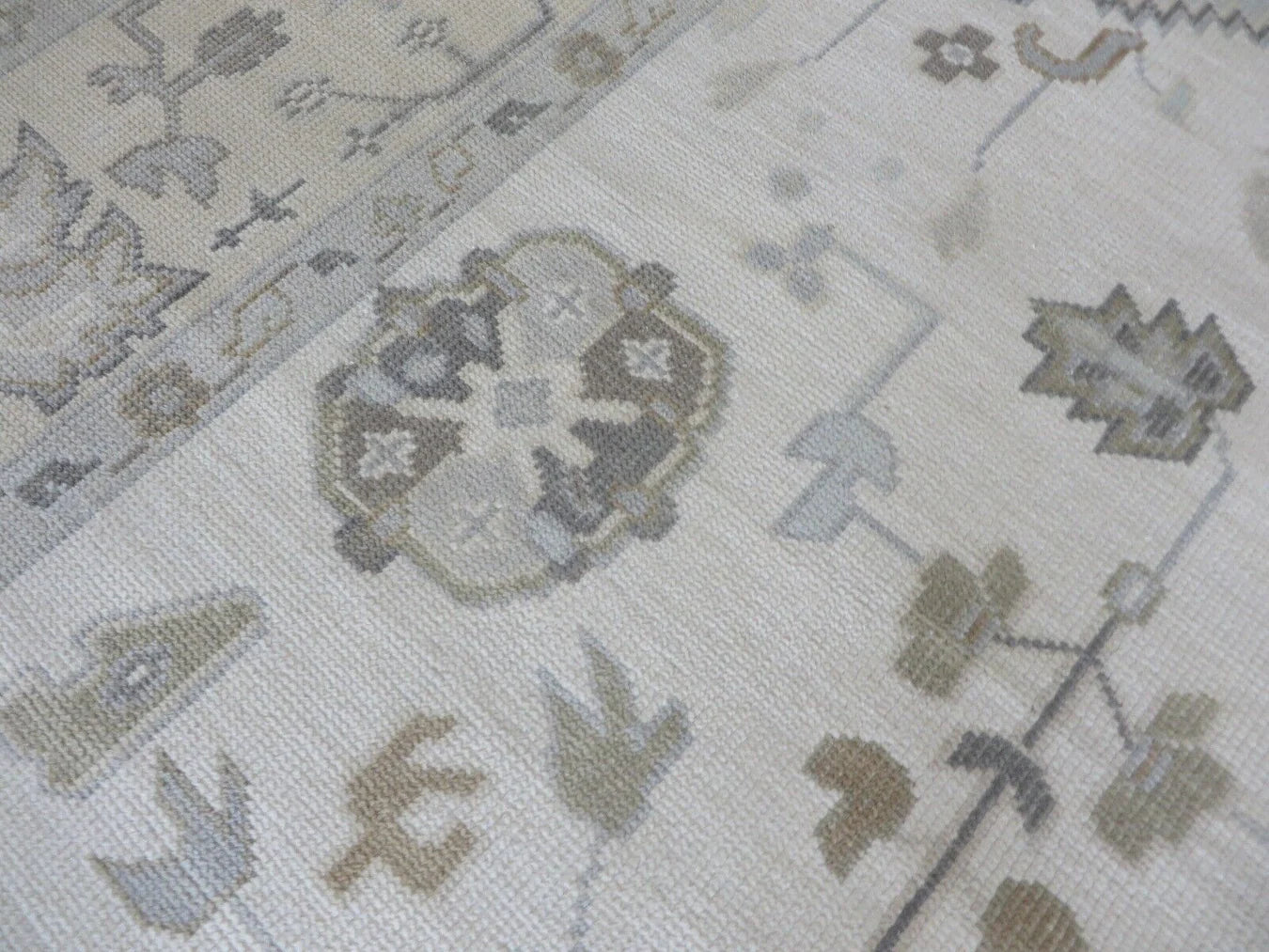 This modern, newly produced hand-knotted Oushak is expertly crafted in India using the Persian knot and composed of 100% hand-spun wool, naturally dyed with vegetable dyes. For custom sizing inquiries, please contact us directly.