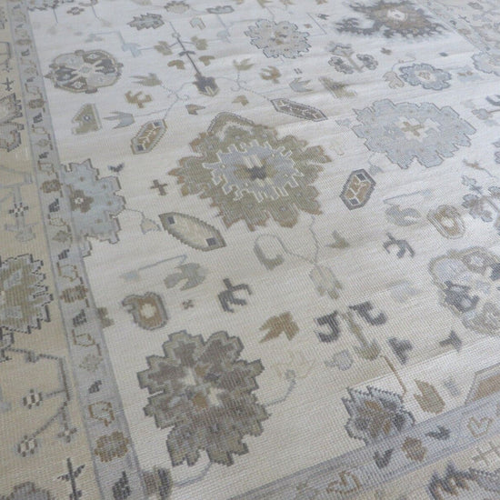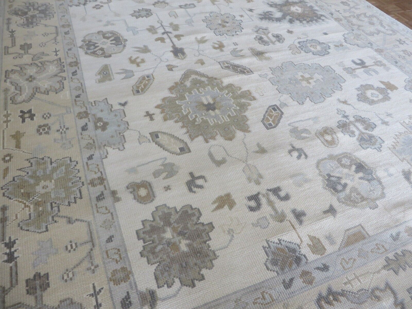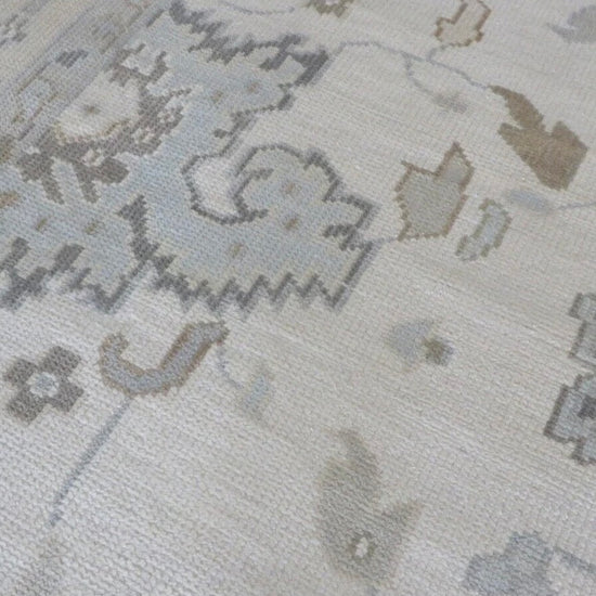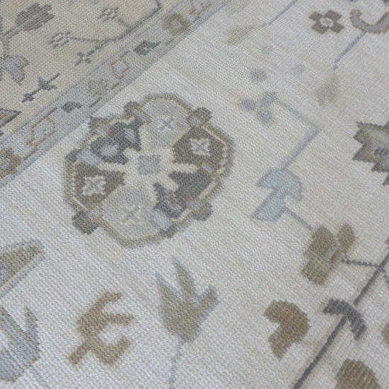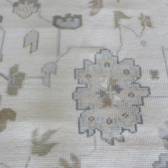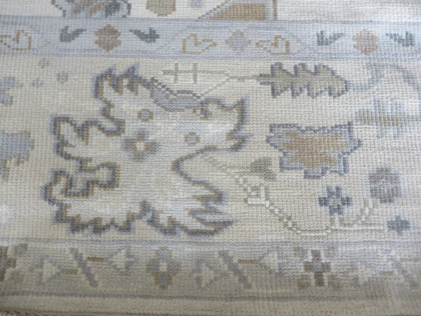 This modern, newly produced hand-knotted Oushak is expertly crafted in India using the Persian knot and composed of 100% hand-spun wool, naturally dyed with vegetable dyes. For custom sizing inquiries, please contact us directly.