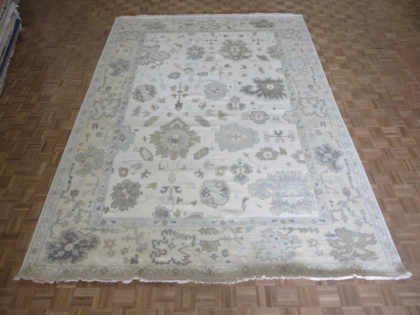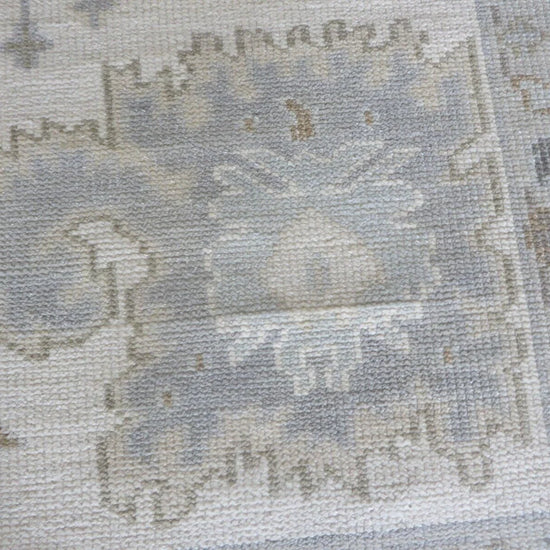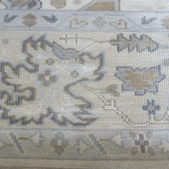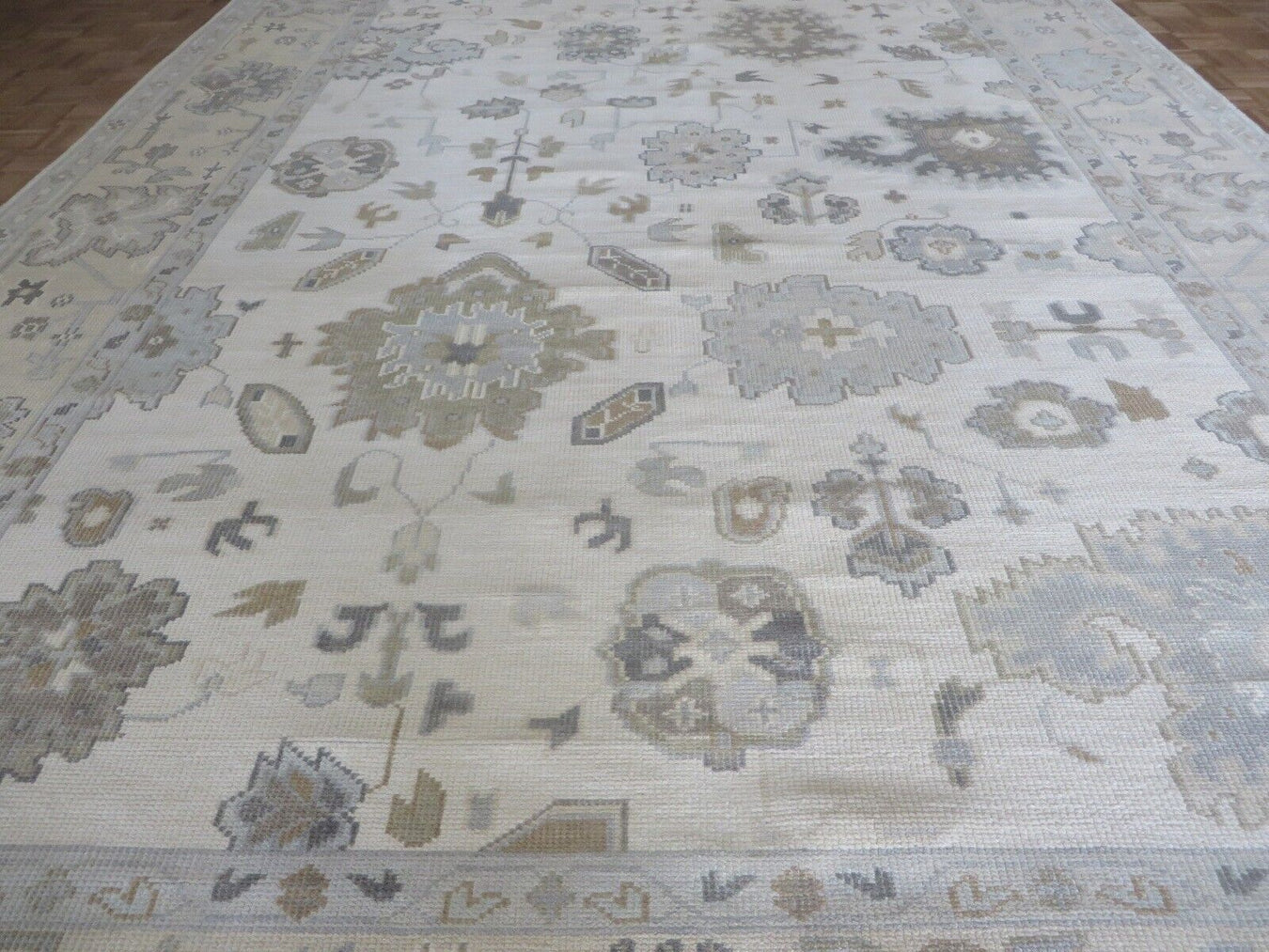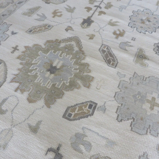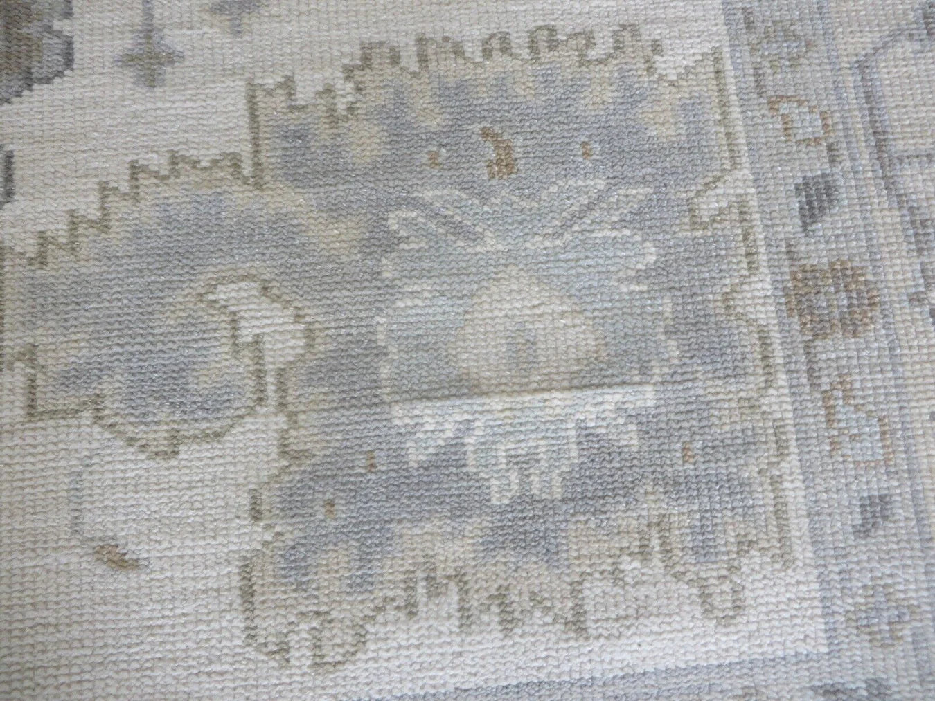 This modern, newly produced hand-knotted Oushak is expertly crafted in India using the Persian knot and composed of 100% hand-spun wool, naturally dyed with vegetable dyes. For custom sizing inquiries, please contact us directly.
